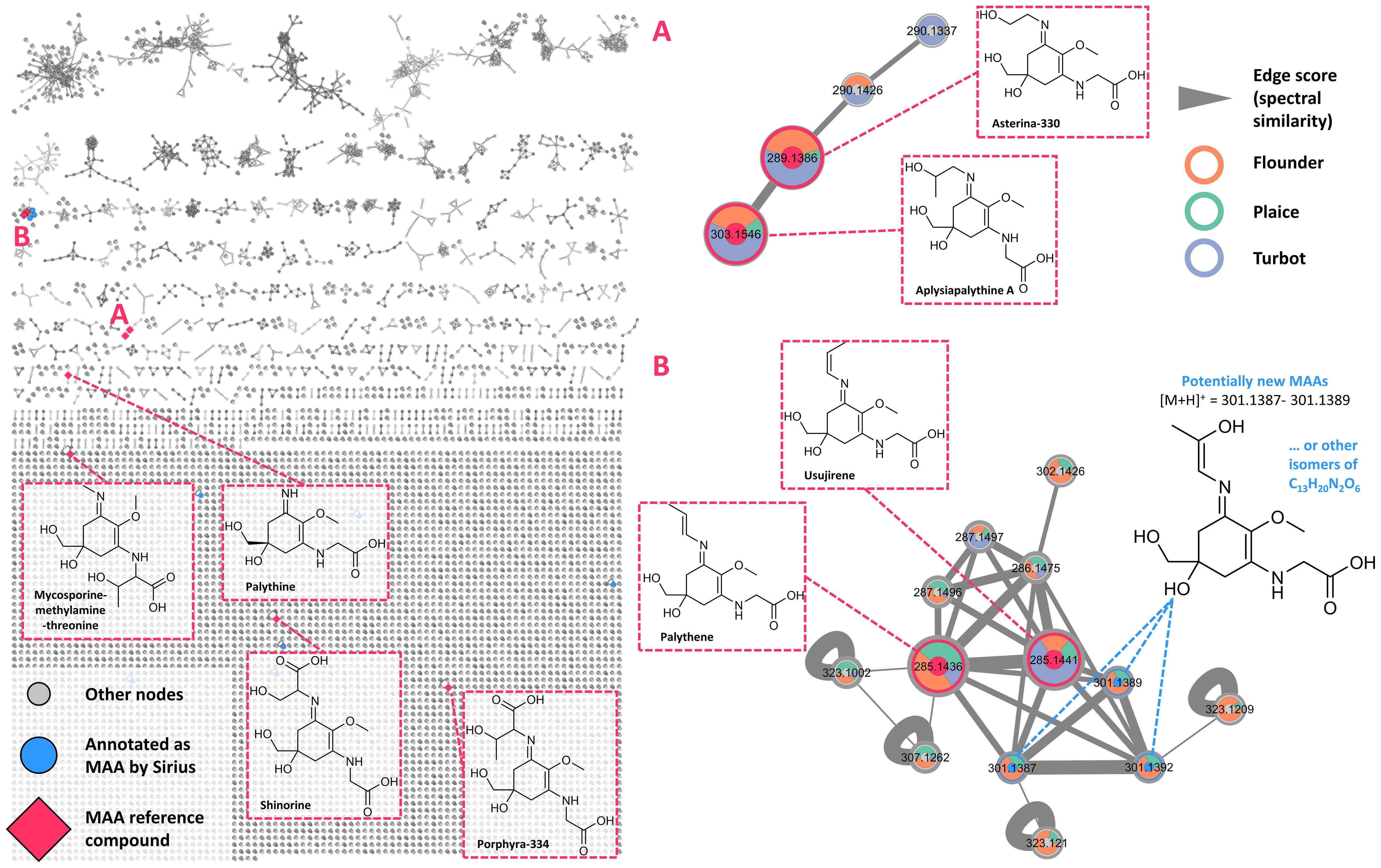 Figure 5. Feature-based molecular network generated from all organ extracts analyzed in this study. Each node represents a feature, with unannotated nodes shown in grey. Nodes annotated as potential mycosporine-like amino acids (MAAs) via SIRIUS are highlighted in blue. Nodes corresponding to confirmed MAA reference compounds (i.e., shinorine, palythine, asterina-330, porphyra-334, aplysiapalythine A, mycosporine-methylamine-threonine, usujirene, and palythene) are marked with red diamonds. (A) Cluster comprising asterina-330 and aplysispalythine A, as well as several nodes (m/z 301.1387–301.1389) potentially representing novel MAAs or isomeric variants of the formula C13H20N2O6. (B) Cluster containing nodes annotated as the cis/trans pair usujirene and palythene. Species-specific occurrence of each node is indicated by colored rings: orange … flounder, light green … plaice, blue … turbot.
