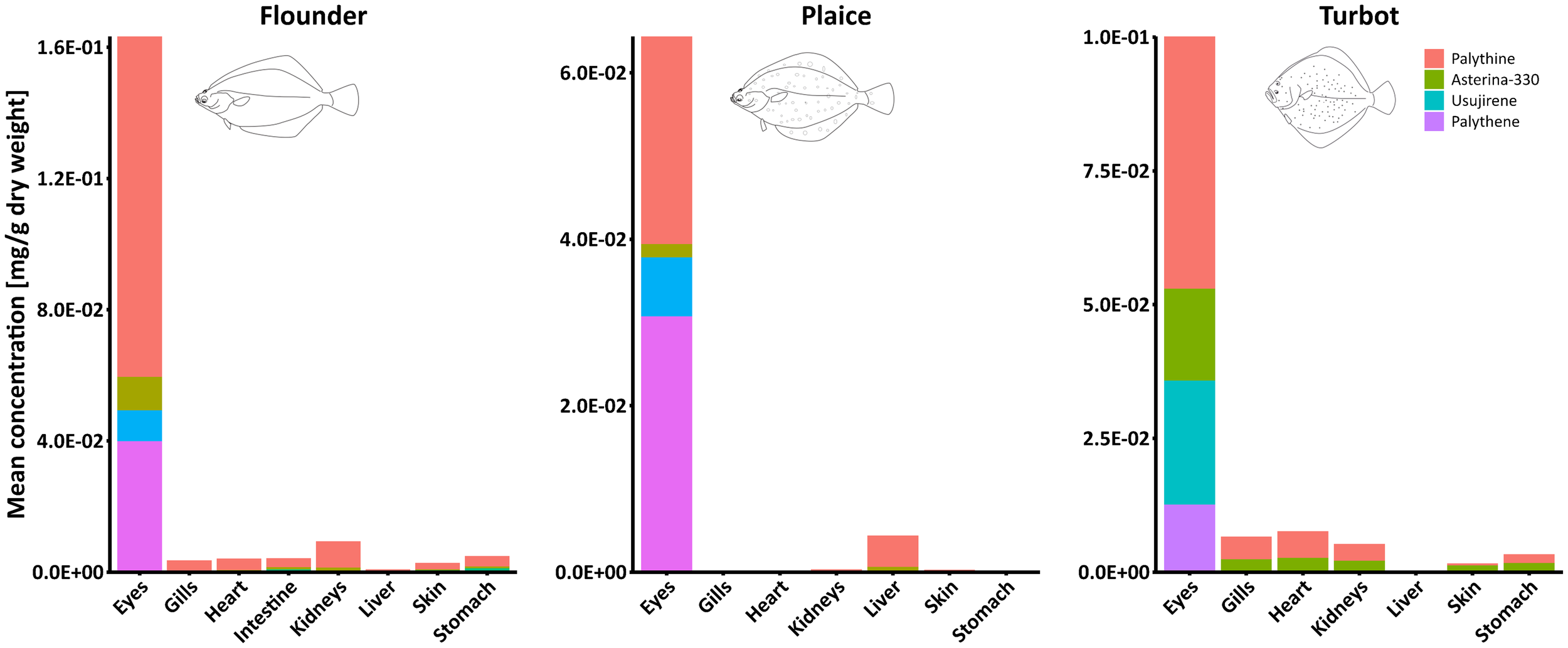 Results of the HPLC-UV analysis indicated the presence of eight MAAs, including shinorine, palythine, asterina-330, porphyra-334, and usujirene/palythene. These compounds are well-documented in algae, supporting a dietary origin (Bonin et al., 2024, and references therein). Across all three flatfish species, palythine was the dominant MAA in the eyes, followed by palythene, usujirene, and asterina-330. Results from turbot were slightly different, with higher levels of usujirene relative to palythene. Concentrations in the eyes were significantly higher than in all other organs inspected, particularly in flounder, where palythine reached up to 0.25 mg g-1 DW. European flounder often use very shallow waters (<1m to only a few meters water depth) outside the spawning season (e.g., Dando, 2011, U. Krumme, unpublished data), which is linked to exposure to elevated UVR.