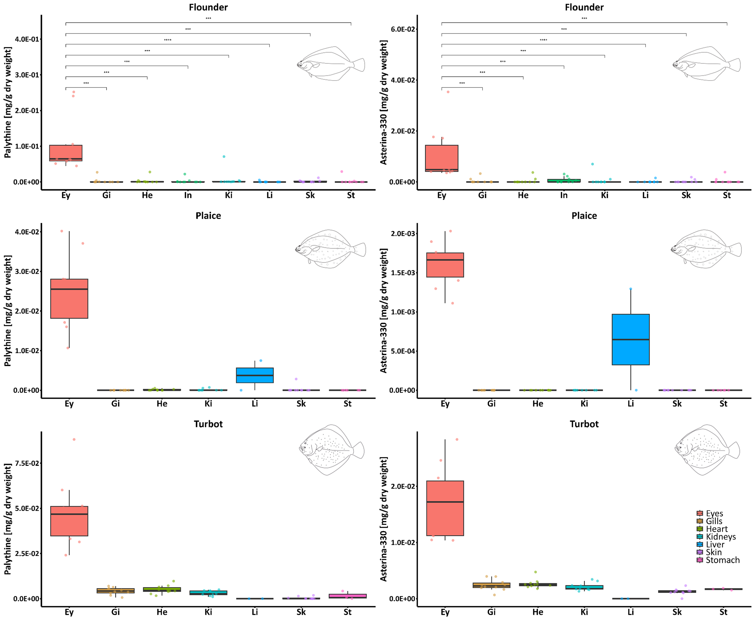 Boxplots showing the distribution of palythine (left side) and asterina-330 (right side) concentrations (mg g-1 DW) across different fish organs and species (top to bottom). Each box represents the interquartile range (IQR), with the median marked as a horizontal line. Individual data points are overlaid as jittered dots. Statistical comparisons between eyes and all other organs of the flounder were performed using the Wilcoxon rank-sum test. Significant differences are indicated by asterisks (***p ≤ 0.001, ****p ≤ 0.0001). Non-significant comparisons (p > 0.05) are not shown. Since complete organ data were available only for the flounder set, statistical comparisons could be performed exclusively for this species. Concentrations reported for the eyes represent the average of values obtained from the left and right eye. Note different y axis scales.