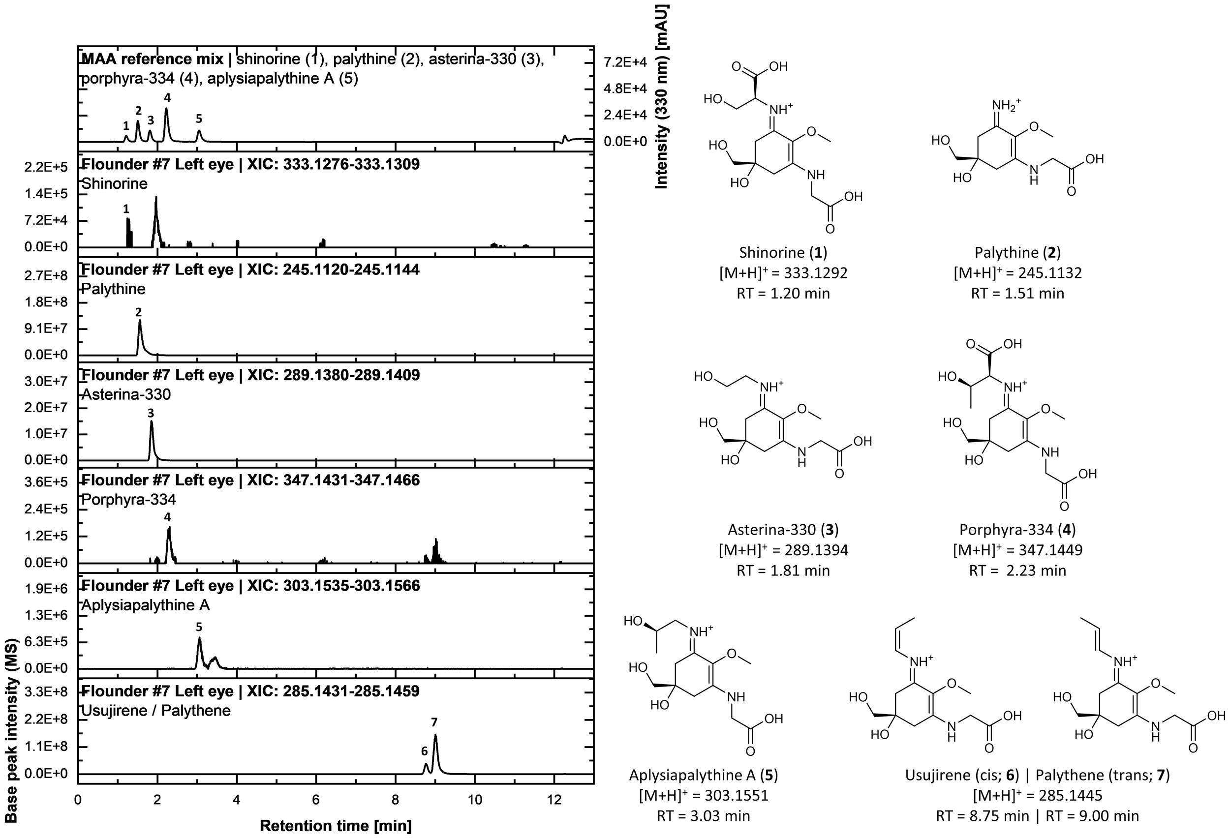 UHPLC analysis of a standard mixture of five mycosporine-like amino acids (MAAs) [i.e., shinorine (1), palythine (2), asterina-330 (3), porphyra-334 (4), and aplysiapalythine A (5)] alongside extracted ion chromatograms (XICs) from the methanolic extract of the left eye of flounder specimen #7. The upper chromatogram displays the UV absorbance trace at 330 nm. Below, XICs were generated with a mass tolerance of 5 ppm based on the calculated exact masses of the protonated molecular species ([M+H]+) for each MAA. The right panel shows the chemical structures of the MAAs, including their calculated exact masses and chromatographic retention times (RT). The identity of usujirene (6) and palythene (7) in the sample was confirmed via evaluation of fragmentation spectra and in-house data.