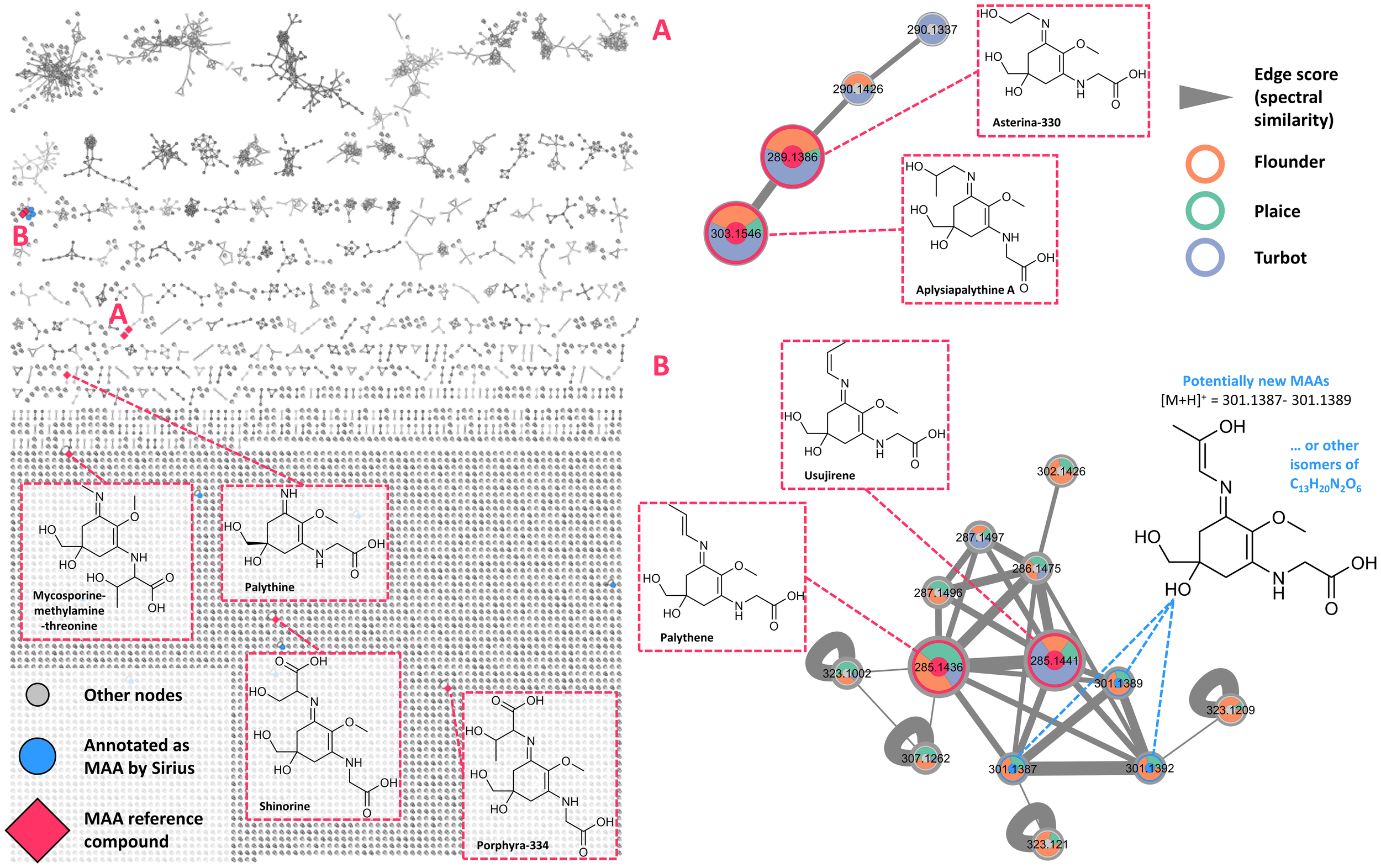 Figure 5 shows the complete FBMN consisting of 7,610 nodes and 8,942 edges, organized into many clusters. Large MAA clusters were not formed with many MAA-related features remaining singletons due to cosine scores below 0.6. These include shinorine, poprhyra-334, and mycosporine-methylamine-threonine. Palythine was represented as a small cluster containing its protonated species [M+H]+, a demethylated derivative [M-CH3+H]+, and a sodium adduct [M+Na]+. Asterina-330 and aplysiapalythine A, differing only by a methyl group, formed a small cluster (Figure 5A).