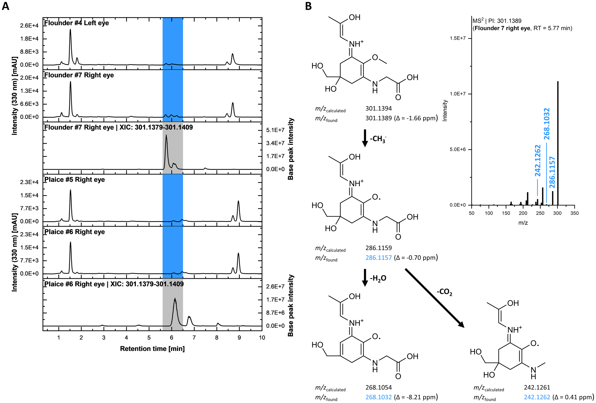 (A) UHPLC chromatograms of eye extracts from flounder (#4 left eye, #7 right eye) and plaice specimens (#5 right eye, #6 right eye). Peaks highlighted in blue indicate UV-absorbing compounds (detection wavelength = 330 nm), potentially corresponding to yet unidentified MAAs. The respective bottom traces show extracted ion chromatograms (XICs) using a 5 ppm mass window around the theoretical m/z of a compound with the molecular formula C13H21N2O6 (protonated species). (B) Top right: MS² spectrum of the ion at m/z 301.1389, eluting at 5.77 min in the extract of the right eye of flounder #7. Left: Fragmentation tree of a putative MAA candidate (shown as the cis isomer, one of two possible isomeric forms) matching the UV signal and MS² spectrum, with characteristic MAA fragmentation reactions. Experimentally observed fragment m/z values are shown along with their corresponding mass errors.