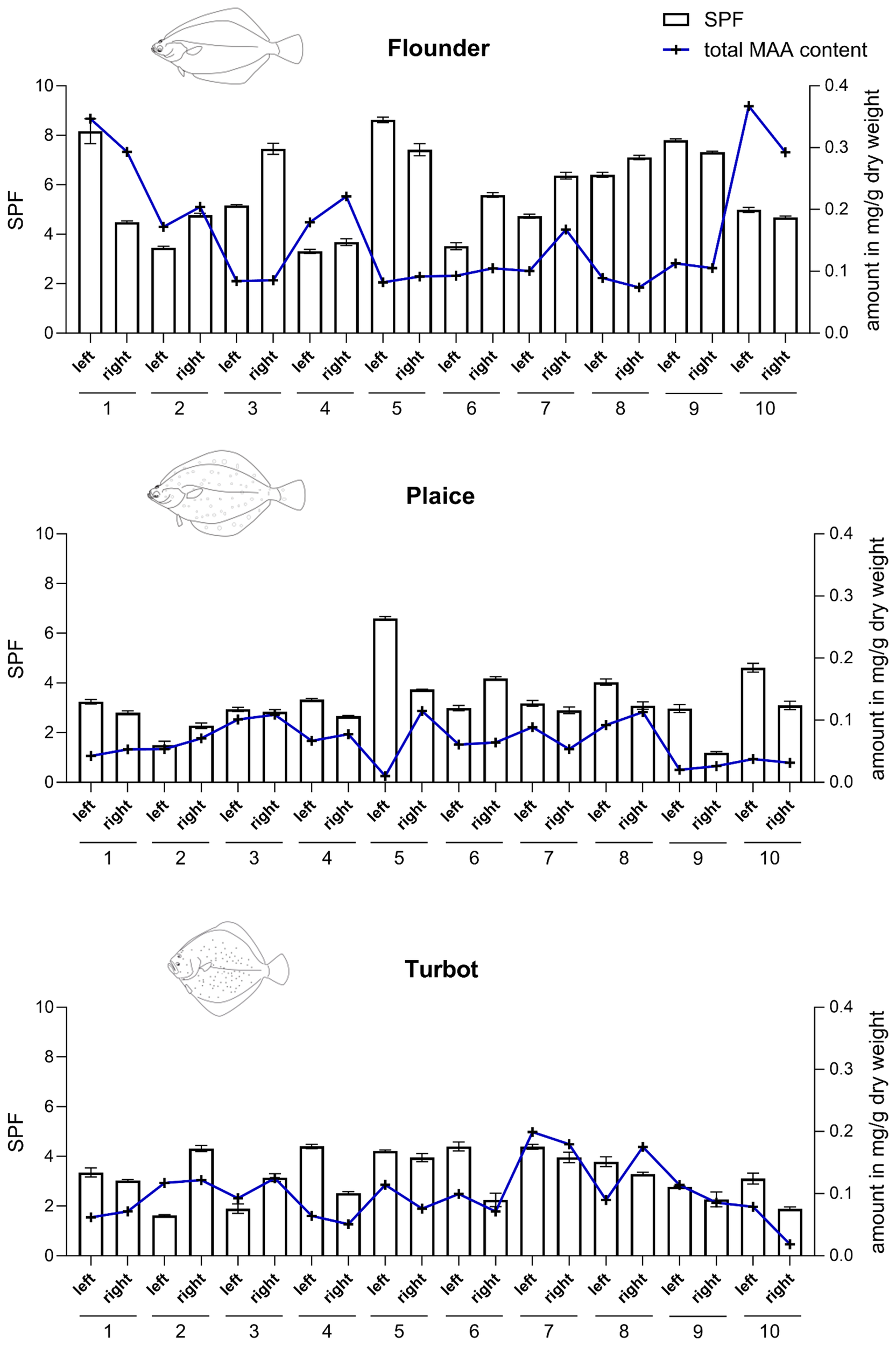 Lastly, the Sun Protection Factor (SPF) values were determined in the fish eye extracts of flounder, plaice, and turbot and compared with the total amount of MAAs in mg g-1 DW (Figure 7). Spectrophotometric analysis was performed across the UV range of 290–320 nm, and SPF values were calculated using the Mansur equation. Overall, a general trend was observed in which higher MAA concentrations were associated with increased UV-protective capacity as measured by SPF, with the fish species exhibiting the highest MAA levels also showing the highest SPF values (e.g., flounder). Eye extracts of flounder had significantly higher SPF values (range: 3.3–8.6; average: 5.7 ± 1.7) than extracts of plaice (range: 1.2–6.6; average: 3.2 ± 1.1) or turbot (range: 1.6–4.4; average: 3.2 ± 0.9). Combining data across all species revealed a modest but statistically significant positive correlation (r = 0.28, p = 0.03) between MAA content and SPF values. However, correlations within individual species were weaker, with only turbot showing a positive, though not statistically significant, relationship (r = 0.39, p = 0.09). Notably, differences in MAA content between the left and right eyes of individual fish were also reflected in corresponding SPF variations, further supporting a relationship between MAA concentration and UV-protective capacity. While some individuals (e.g., flounder #1) exhibited conspicuously different total MAA values of 0.17 and 0.33 mg g-1 DW in the right and left eye, respectively, others (e.g., flounder #4) showed almost identical contents (Figure 7). Nevertheless, while in flounder 6 out of 10 right eyes contained higher total MAA levels compared to the corresponding left eyes, in plaice and turbot 8 out of 10 left eyes exhibited a higher total content (Figure 7). Hence, at least in plaice and turbot a trend for preferential MAA enrichment in the left eyes was visible.