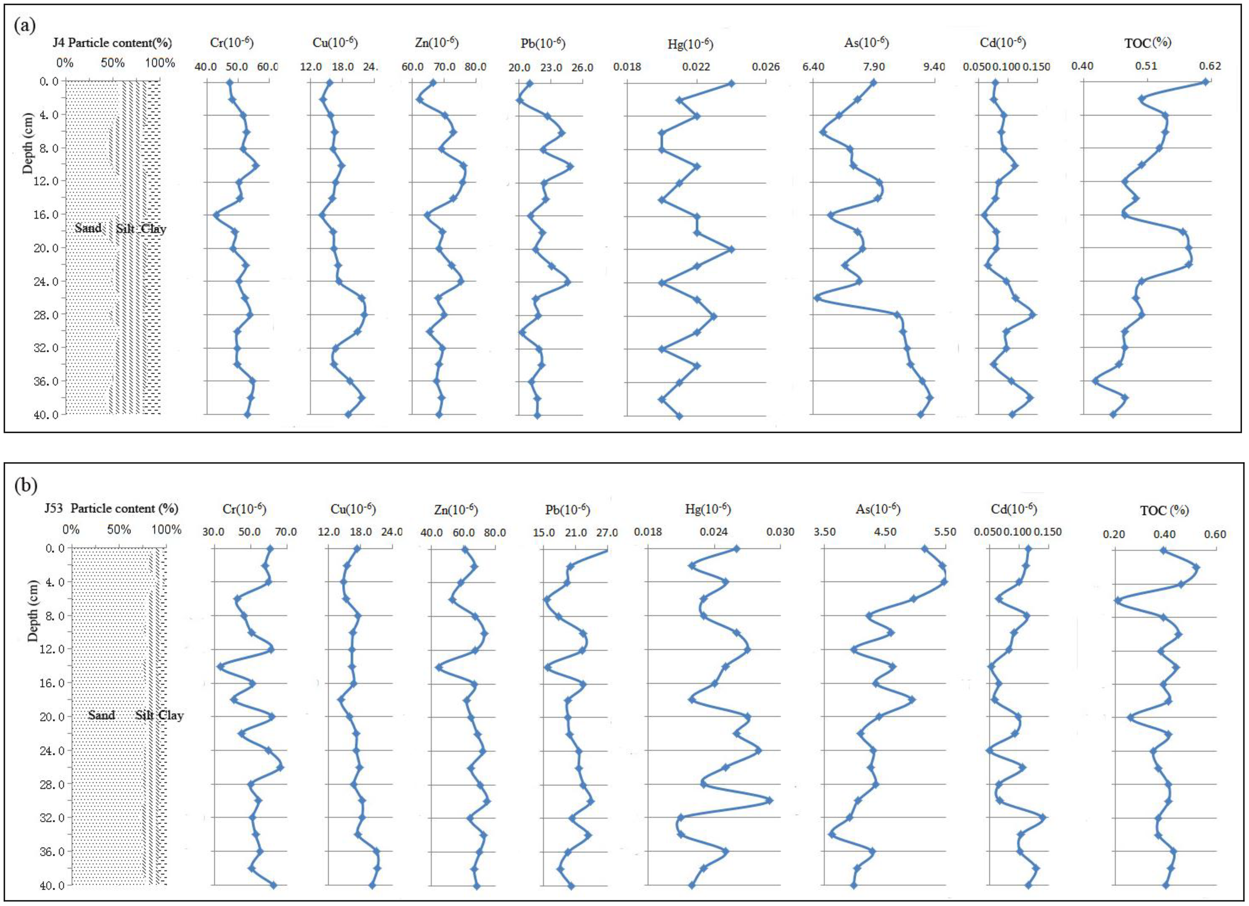 The average contents of Cr, Cu, Zn, Pb, Hg, As, and Cd in the surface sediments of the study area were 51.85, 16.95, 66.93, 21.32, 0.025, 5.58, and 0.083 × mg/kg, respectively (as shown in Table 1). The maximum concentrations of these metals at the individual station were all below the threshold values of the current marine sediment quality standard, class I, in China. Furthermore, the mean concentrations were generally lower than those reported for the background values of mainland China sediments, the Yangtze River estuary, and the nearshore of the ECS. In contrast, the maximum concentrations observed in this study were broadly comparable to those reference values. When compared with other depositional environments, the concentrations in the study area were significantly lower than those typically in the mud-rich sediments of the inner ECS shelf. The spatial pattern aligns with existing literature, which consistently reports a decreasing gradient of heavy metal concentrations from nearshore zones to offshore areas (Zhao, 1983; Wang J. et al., 2003; Xu et al., 2018a). The two sediment cores (J4 and J53) that were analyzed also revealed concentrations comparable in magnitude to those of the surface samples, suggesting relatively stable depositional and post-depositional geochemical conditions across the shelf.