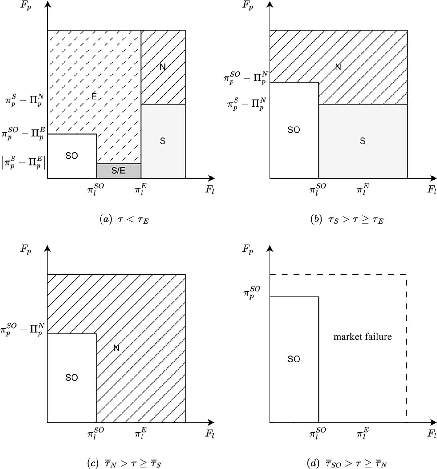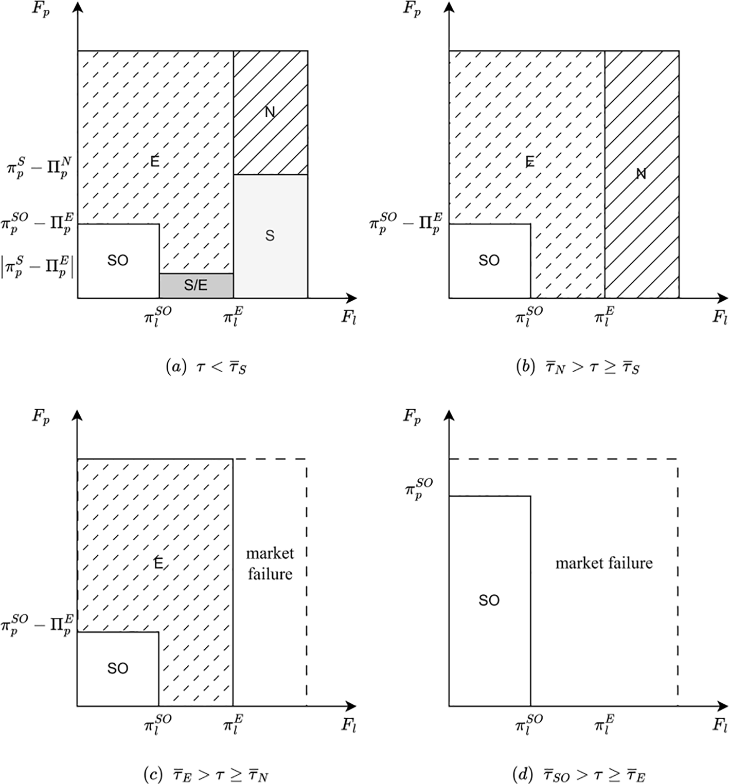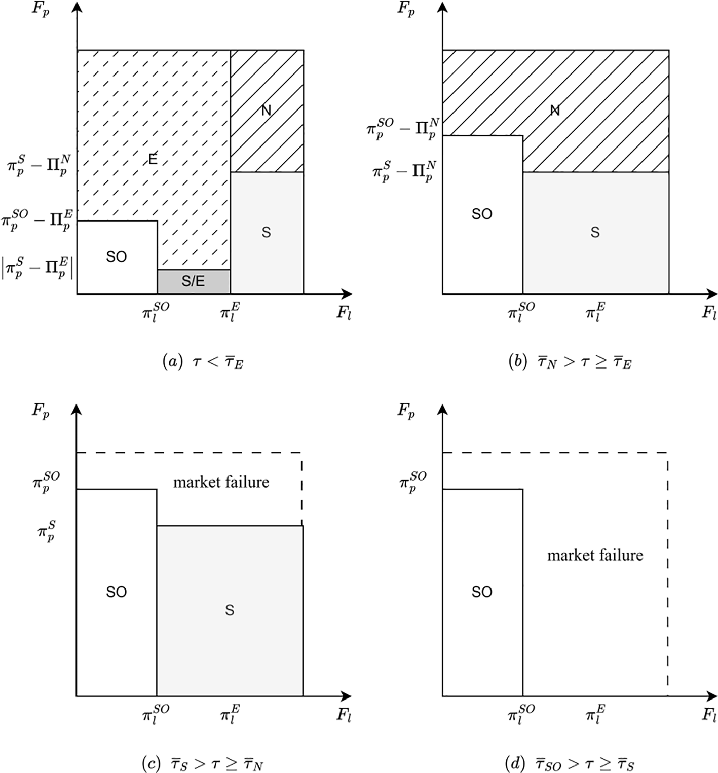 Under this condition, the patentee uses their own green innovation technology in shipping but does not license it. At the same time, applying (or commercializing) the technology requires a fixed investment . Then, the profit function of patentee can be expressed by , while the licensee’s profit function keeps the same with strategy N. Here, we refer to the payoff part that does not account for fixed investments as , where .