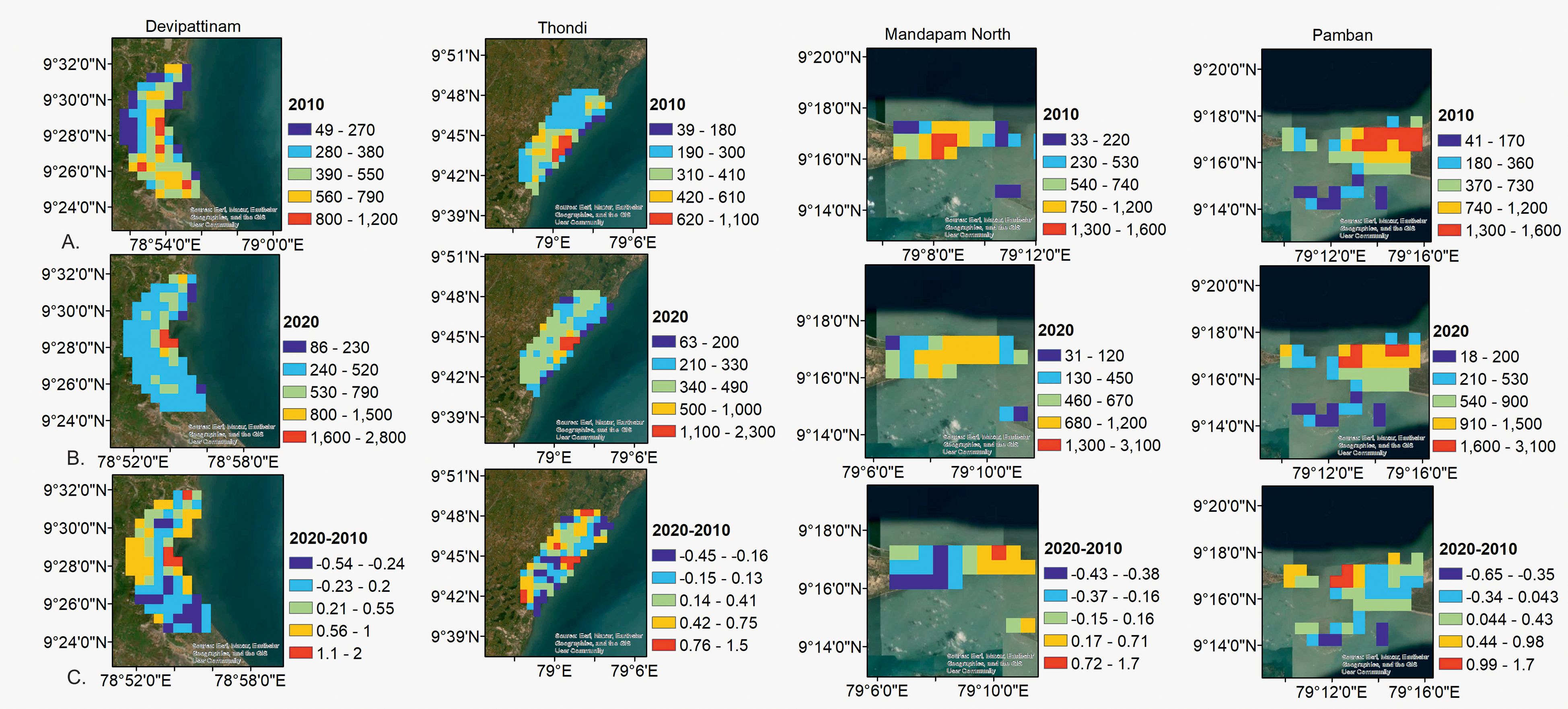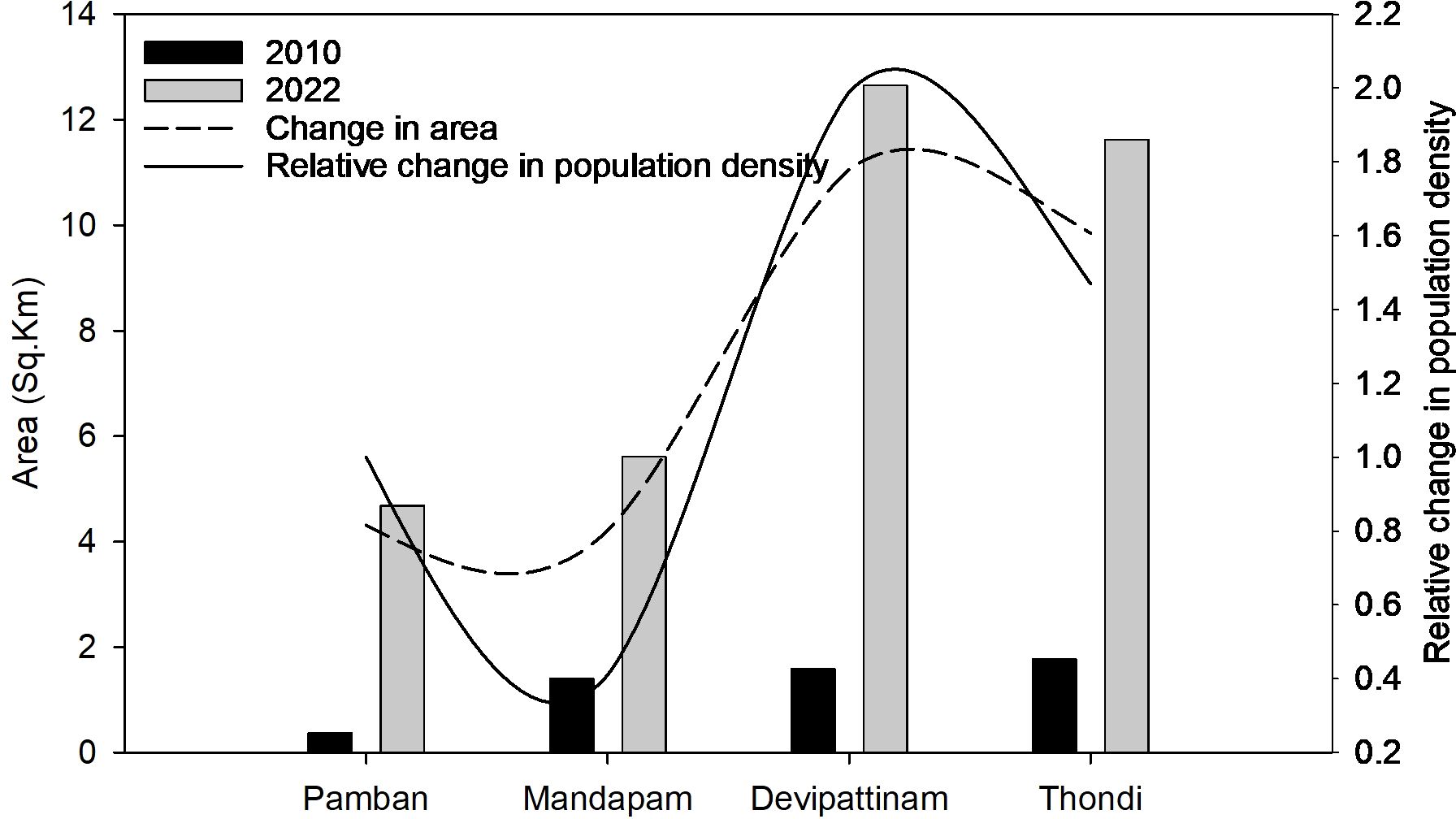 The relative change in NDBI between 2022 and 2010 showed a significant increase in built-up area at all four stations (p<0.05), with Thondi (11.62 km2 in 2022 from 1.8 km2 in 2010), and Devipattinam (12.65 km2 in 2022 from 1.6 km2 in 2010) stations showing the highest relative increase (Figure 2). Population density analysis within the 5 km buffer around each sampling point showed that there was an overall increase in population density from 2010 to 2020 across all stations (Figure 3), with the highest population growth recorded at Devipattinam and Thondi.