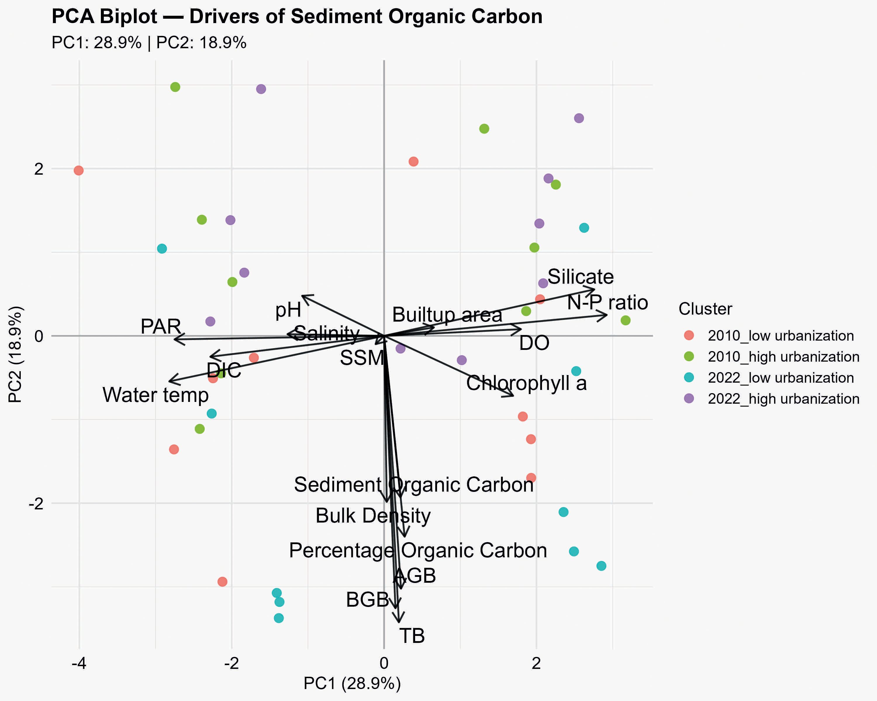PCA was used to summarize the prevalent patterns in environmental variables through reducing the data complexity and also identifying major axis of variation. This helps in identifying the major environmental gradients that influence the seagrass sediment organic carbon dynamics. PCA was performed using the ‘prcomp’ function in R with a correlation matrix. The first two principal components (PC1 and PC2) were interpreted using variable loadings greater than 0.3. Cluster-wise mean PC scores were calculated to summarize the effects of urbanization and temporal changes on the environmental and biogeochemical parameters.