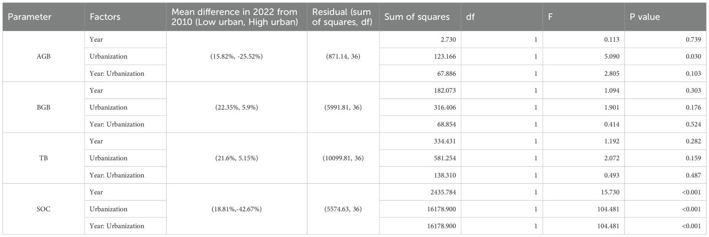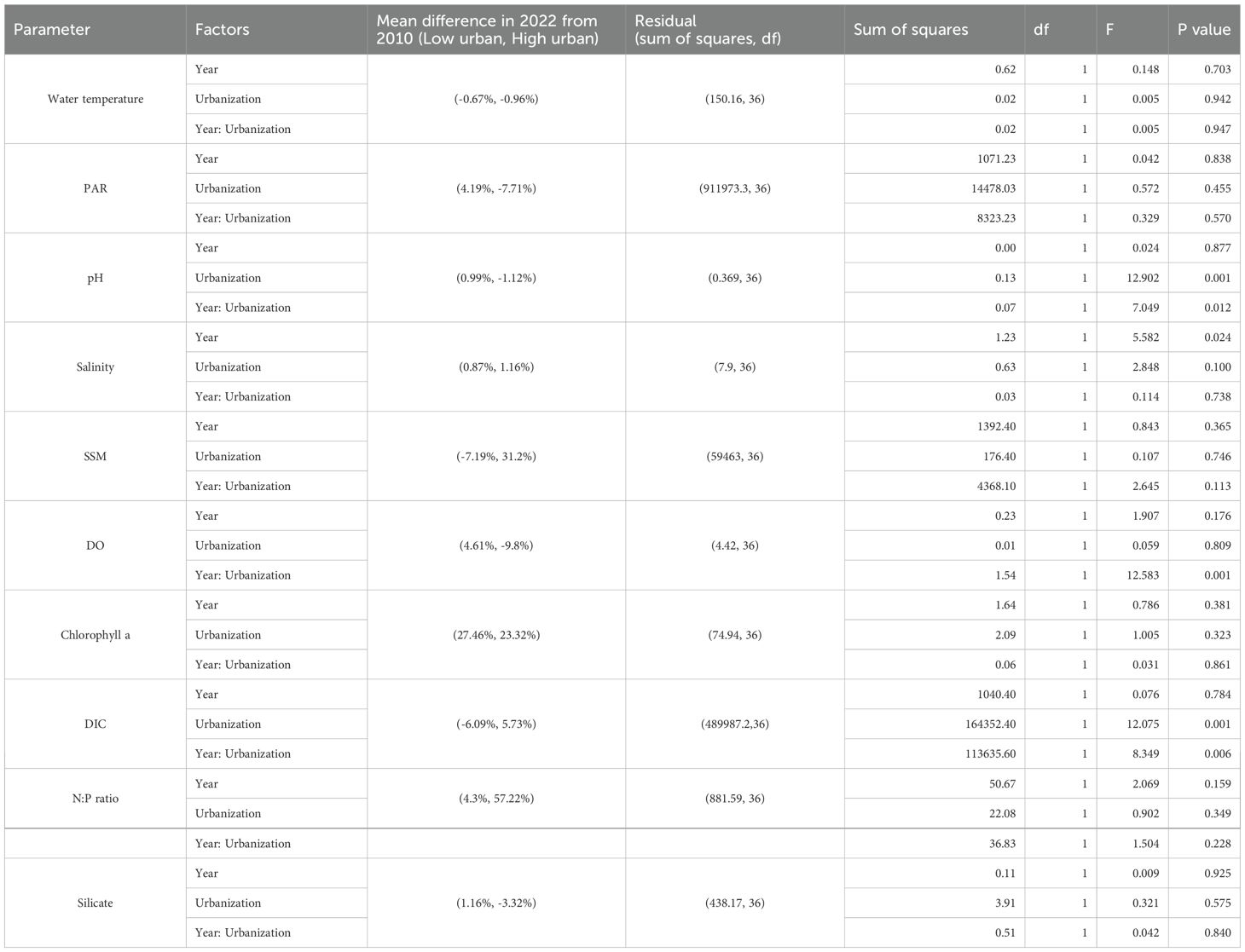 Z-score transformation was used for the standardization of all continuous variables to normalize scales, and to ensure comparability across metrics. Outliers were visually inspected and retained if they represented true environmental variability. Missing data were handled via pairwise deletion (Newman, 2014), as missing values in our dataset were relatively few, scattered and randomly distributed. Two-way analysis of variance (ANOVA) was employed to test the interactive effects of urbanization level (low vs. high) during 2010 and 2022 on variables such as seagrass biomass, sediment organic carbon, and water quality variables. Significant effects and interactions were determined using F-tests at 95% level of significance. To assess the temporal changes of these variables, relative change of recorded variables between 2010 and 2022 was calculated, and independent t-tests were applied to compare the temporal changes occurred in the low and high urbanization locations. This allows to evaluate whether urbanization affects the magnitude of temporal changes in seagrass biomass, and sediment organic carbon content.