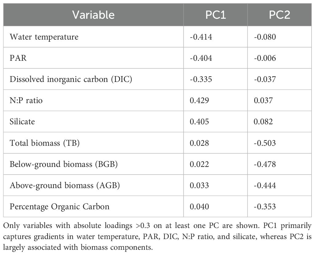 Table 3. PCA loadings for PC1 and PC2 showing environmental and biomass variables with strong contributions.