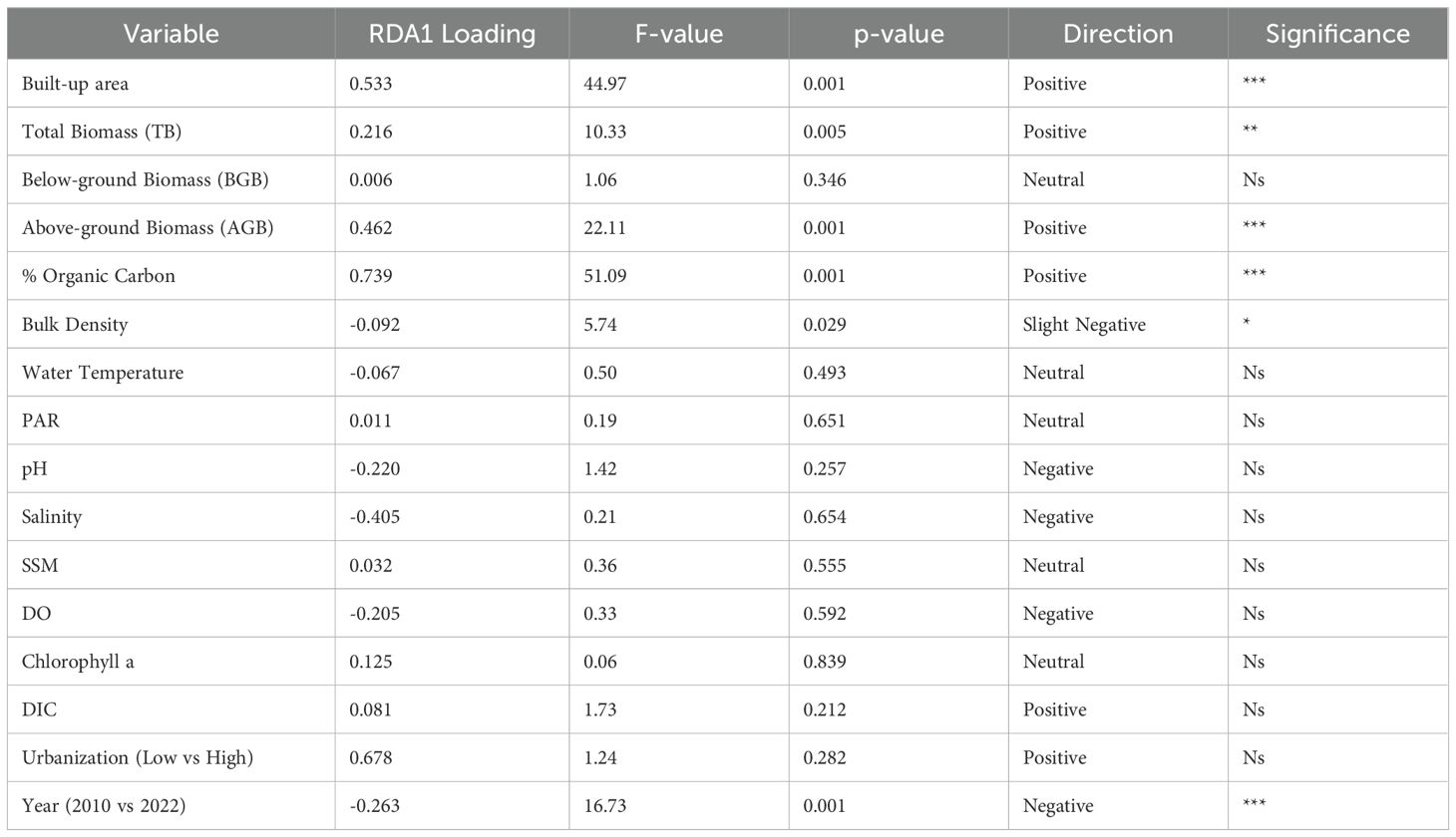 While PCA identifies the major patterns of variation in the dataset without considering the underlying environmental or temporal drivers, the Redundancy Data Analysis (RDA) allows us to explicitly assess the influence of such explanatory variables on the observed multivariate patterns. The RDA results thus complement the PCA by linking the main axes of variation to specific environmental and temporal gradients (Table 4). RDA confirmed the PCA patterns, with RDA1 explaining 87.3% of the constrained variation (F = 261.17, p = 0.001). Built-up area was the strongest positive driver, while percentage organic carbon also aligned positively with RDA1, driven mainly by elevated values in 2022 low-urbanization sites rather than high-urban sites. Above-ground biomass showed a similar positive association, whereas salinity and pH were negatively related to urban influence. Temporal effects were significant, with 2022 sites generally shifting towards the positive RDA1 end, reflecting both expanded built-up area in high-urban sites and moderate nutrient accumulation in some low-urban sites. Notably, high urbanization was associated with reduced seagrass biomass and lower sediment organic carbon, indicating persistent anthropogenic pressure and habitat degradation.