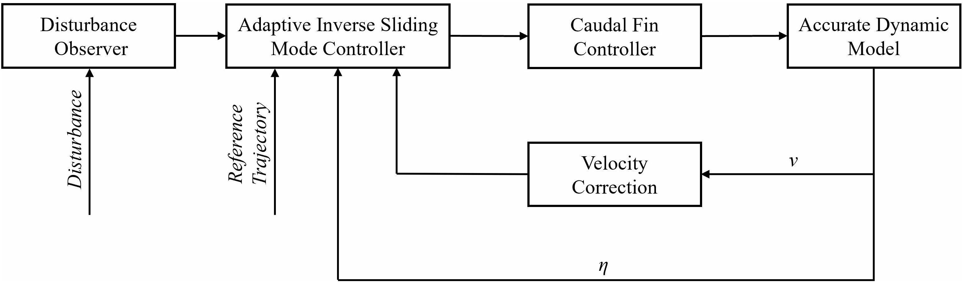 An adaptive inverse sliding mode controller is designed based on an exponentially converged nonlinear disturbance observer, which compensates for large external disturbances. This controller enables the robotic fish to adjust to real-time current variations in the water, ensuring that these disturbances do not affect the system’s robustness, thereby further reducing the tracking error.