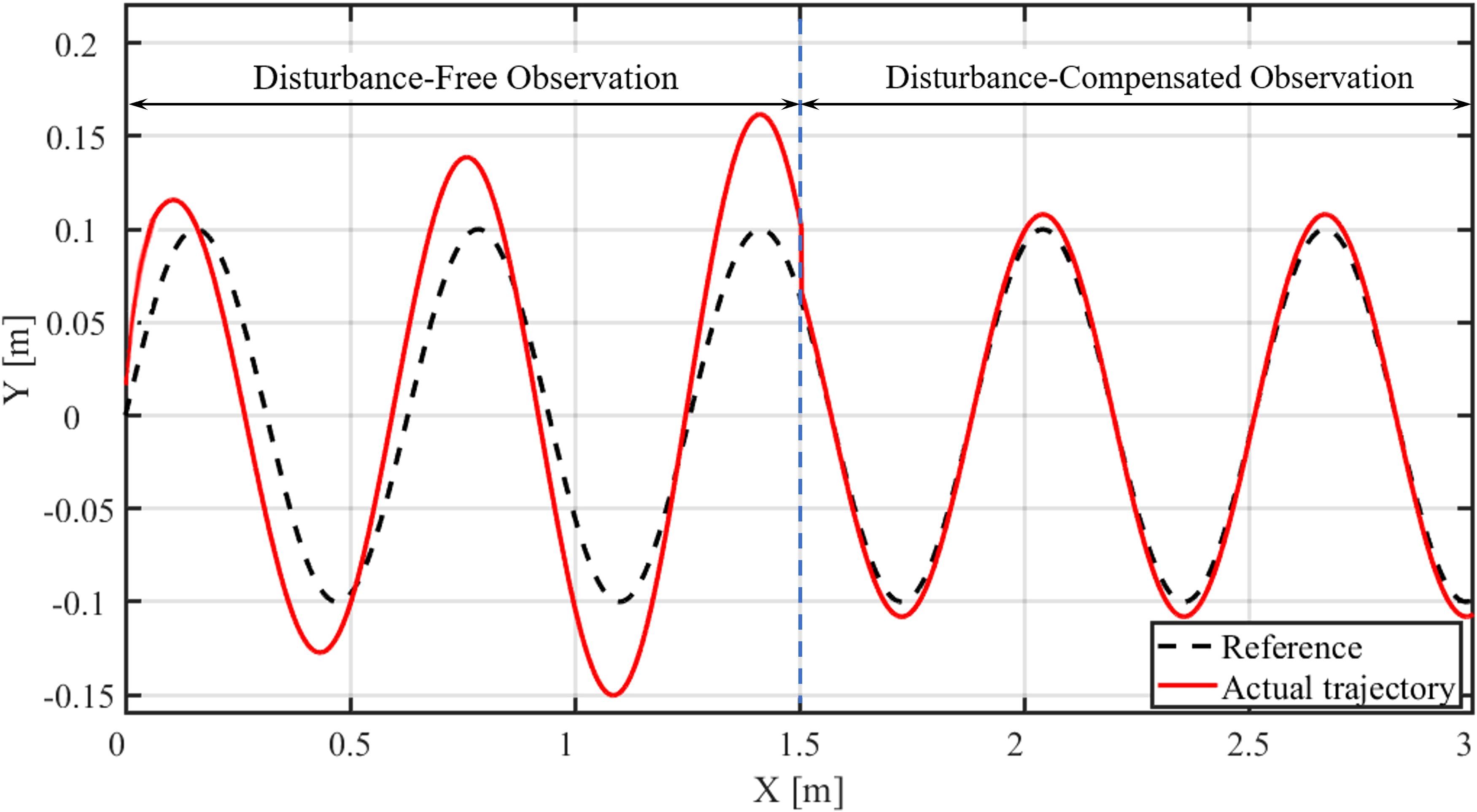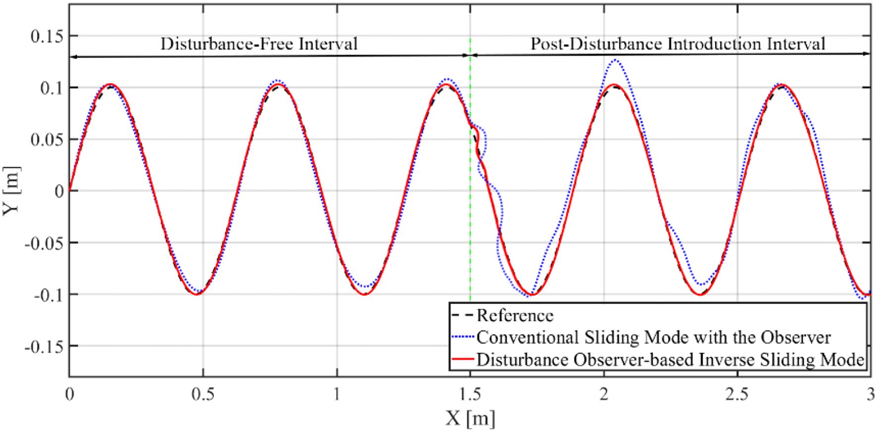 ![Graph showing three curves representing system responses over time with X-axis labeled “X [m]” and Y-axis labeled “Y [m]”. The intervals are marked as “Disturbance-Free” and “Post-Disturbance Introduction.” The legend identifies curves as reference (black dashed), conventional sliding mode (blue dotted), and disturbance observer-based inverse sliding mode (red solid).](https://www.frontiersin.org/files/Articles/1691667/fmars-12-1691667-HTML/image_m/fmars-12-1691667-g005.jpg)