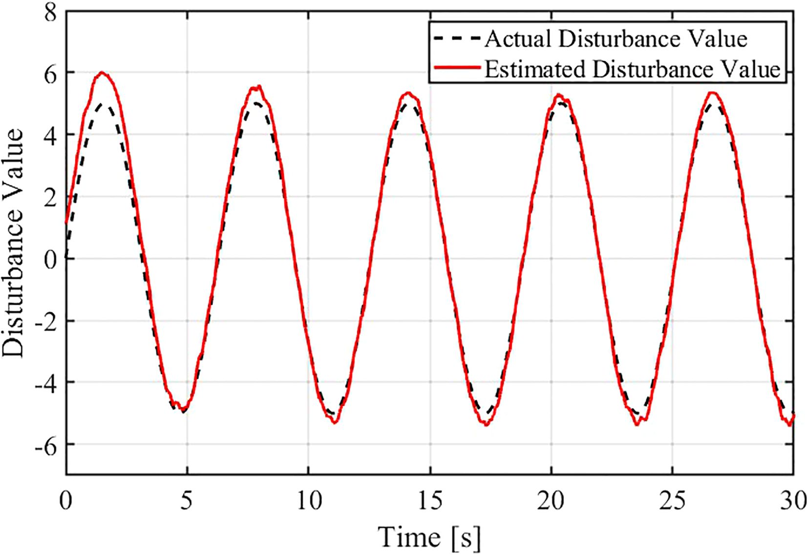 To evaluate the effectiveness of the designed controller, the output data for the controller with the interference observer is analyzed. Figure 6 shows the comparison between the actual input interference value and the observed estimated interference value from the nonlinear disturbance observer. The results indicate that the observed interference value can accurately track the actual interference and reaches a steady state after approximately 3 seconds. After this transient period, the two values coincide closely. Although there is a transient fluctuation when the interference signal changes suddenly (with a peak error of about 10%), the observer quickly restores stable tracking, demonstrating good dynamic response capability. Only small high-frequency fluctuations are observed in the steady-state phase (amplitude < 2%), and the overall tracking error is less than 5%, verifying the effectiveness of the designed controller. The error is less than 5%, verifying the accuracy and robustness of the interference observer. The simulation results show that the observed interference value closely matches the given interference value. After approximately 3 seconds of pre-estimation time, the interference curve stabilizes and coincides with the actual interference value.
