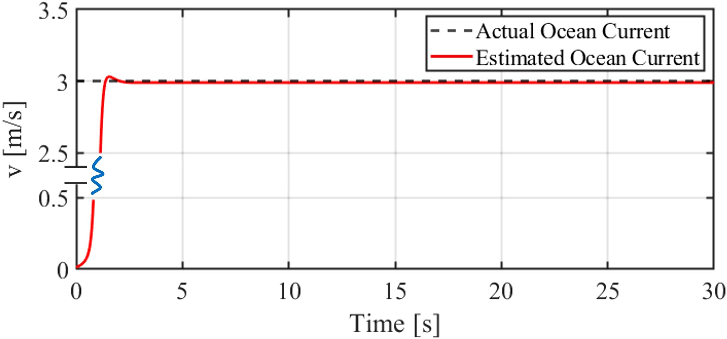 The following demonstrates the effectiveness of the adaptive inverse sliding mode controller, with Figure 7 showing the comparison between the actual current velocity and the observed velocity from the controller. The simulation results show that, under a strong current velocity of 3 m/s, the controller remains in the pre-estimation stage with minimal changes during the first 1 second. At around 1.5 seconds, it begins to rise sharply, approaching the given actual current velocity, and stabilizes after a short adjustment within approximately 3 seconds, aligning closely with the given actual current value.