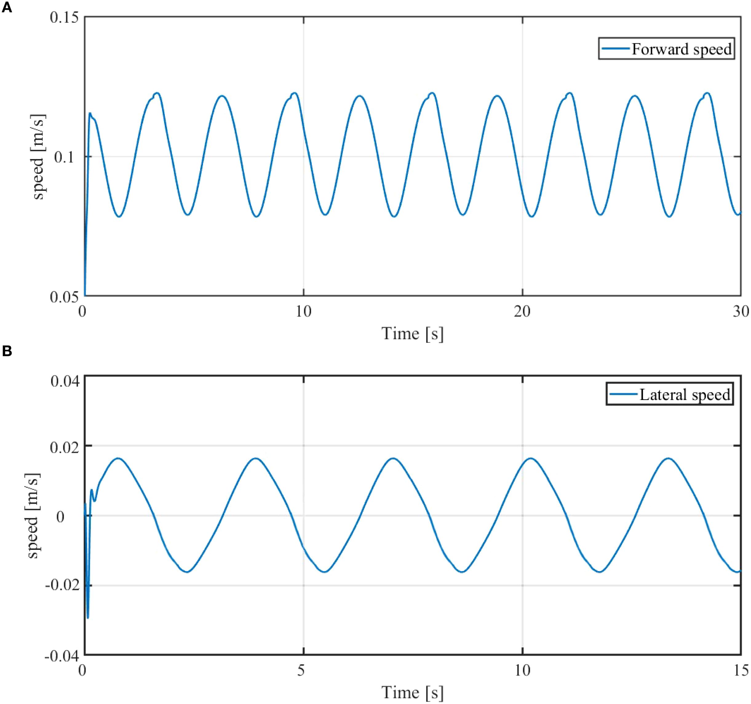 Figure 9. Velocity change of machine fish. (A) Forward speed of the robot fish, (B) Lateral speed of the robot fish.