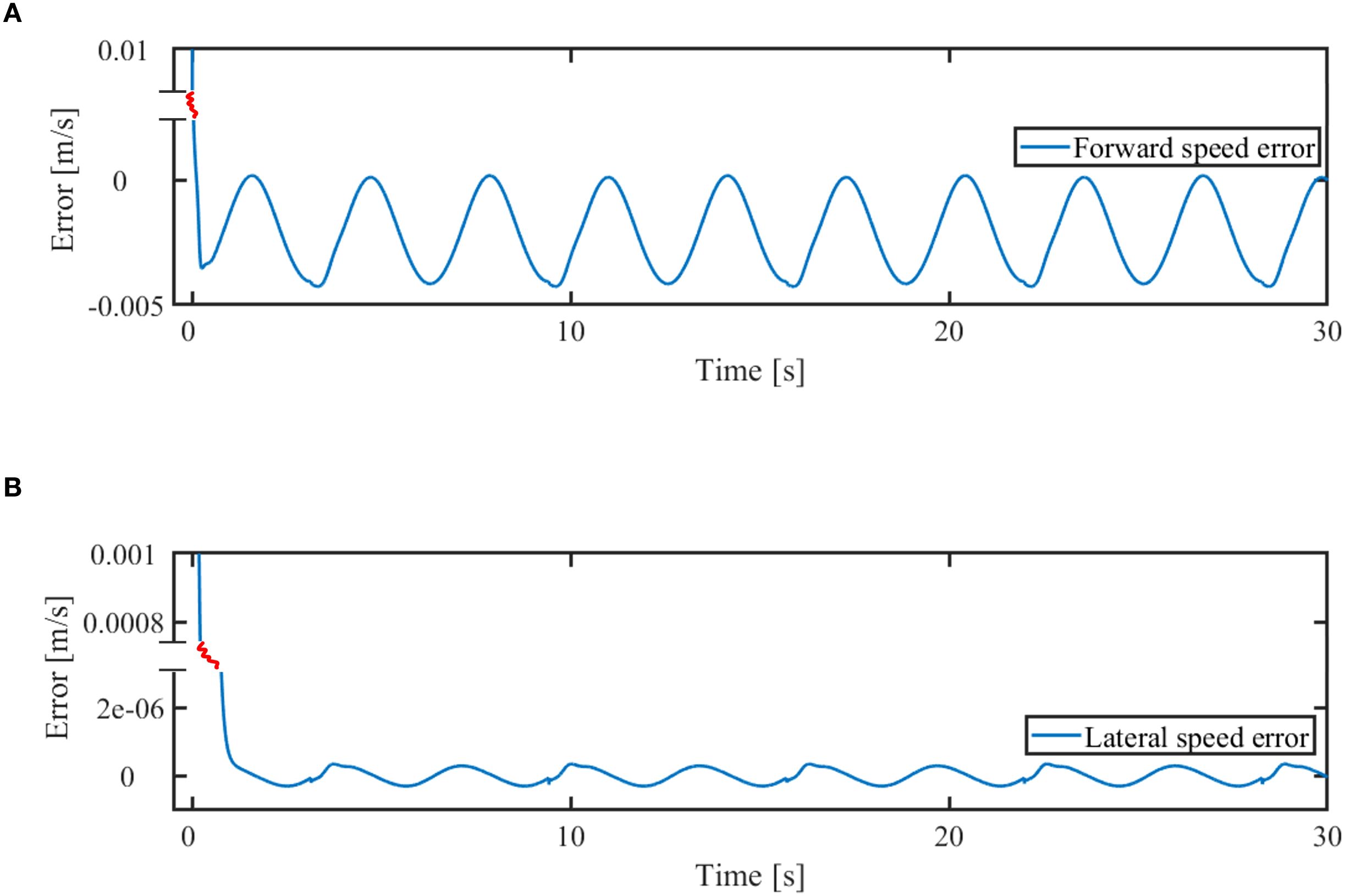 The tracking error of the robotic fish’s velocity is analyzed below, as shown in Figure 10. Figure 10A illustrates the forward velocity error, while Figure 10B shows the lateral velocity error. The simulation results show that the forward velocity error exhibits small periodic fluctuations between approximately -0.004 m/s and 0.001 m/s. These fluctuations are caused by the swinging motion used by the robotic fish to mimic real fish swimming, and also reflect the dynamic response characteristics of the velocity correction system as it adjusts the robotic fish’s velocity to match the target. In contrast, the lateral velocity error remains close to zero, except during the initial phase, which is attributed to the small magnitude and slow variation of the lateral velocity. Both forward and lateral velocity errors remain within a small range, indicating that the velocity control system exhibits good tracking performance and stability, and can effectively minimize the deviation between the actual and desired velocities of the robotic fish.