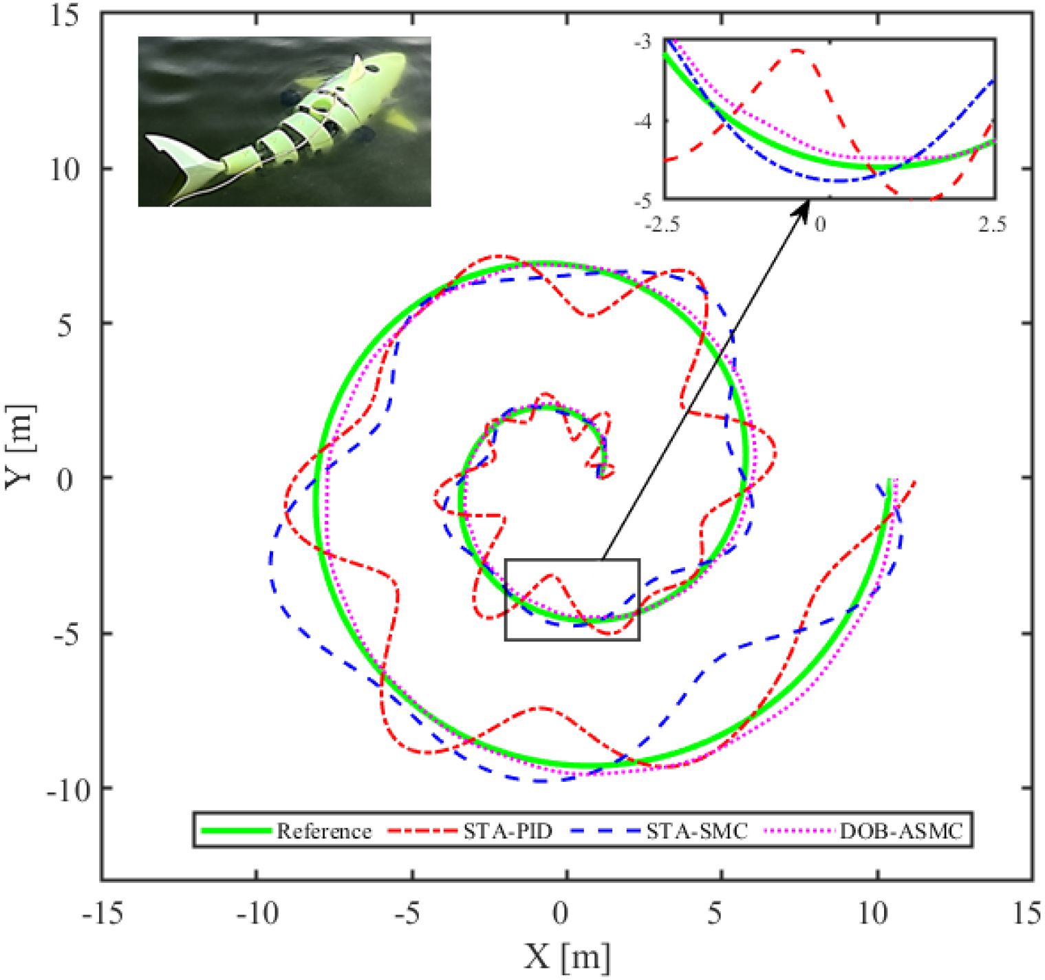 Figure 12 depicts the trajectory tracking results of different control methods for a robotic fish under strong disturbance conditions. It can be observed that the STA-PID and STA-SMC trajectories deviate significantly from the reference trajectory, with large fluctuations and obvious tracking errors. In contrast, the DOB-ASMC trajectory is much closer to the reference trajectory. The local magnification in the upper right corner further illustrates that DOB-ASMC maintains a very small deviation from the reference trajectory throughout the tracking process, while the other two methods exhibit larger deviations. This indicates that the DOB-ASMC controller demonstrates superior trajectory tracking accuracy and robustness under strong disturbances compared to STA-PID and STA-SMC.