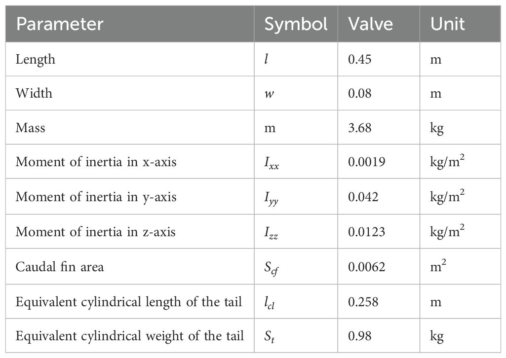 The sinusoidal oscillatory terms present in the caudal fin’s force function, which includes both sine and cosine components, complicate the separation of the control variables for the caudal fin. To invert the caudal fin control function, this paper applies the method of averaging combined with Taylor expansion. It uses polynomials to approximate the oscillatory terms (e.g., trigonometric functions) in the caudal fin force, thereby equivalently simplifying the force expression (Wang et al., 2013). The averaging method is given in Equation 44.