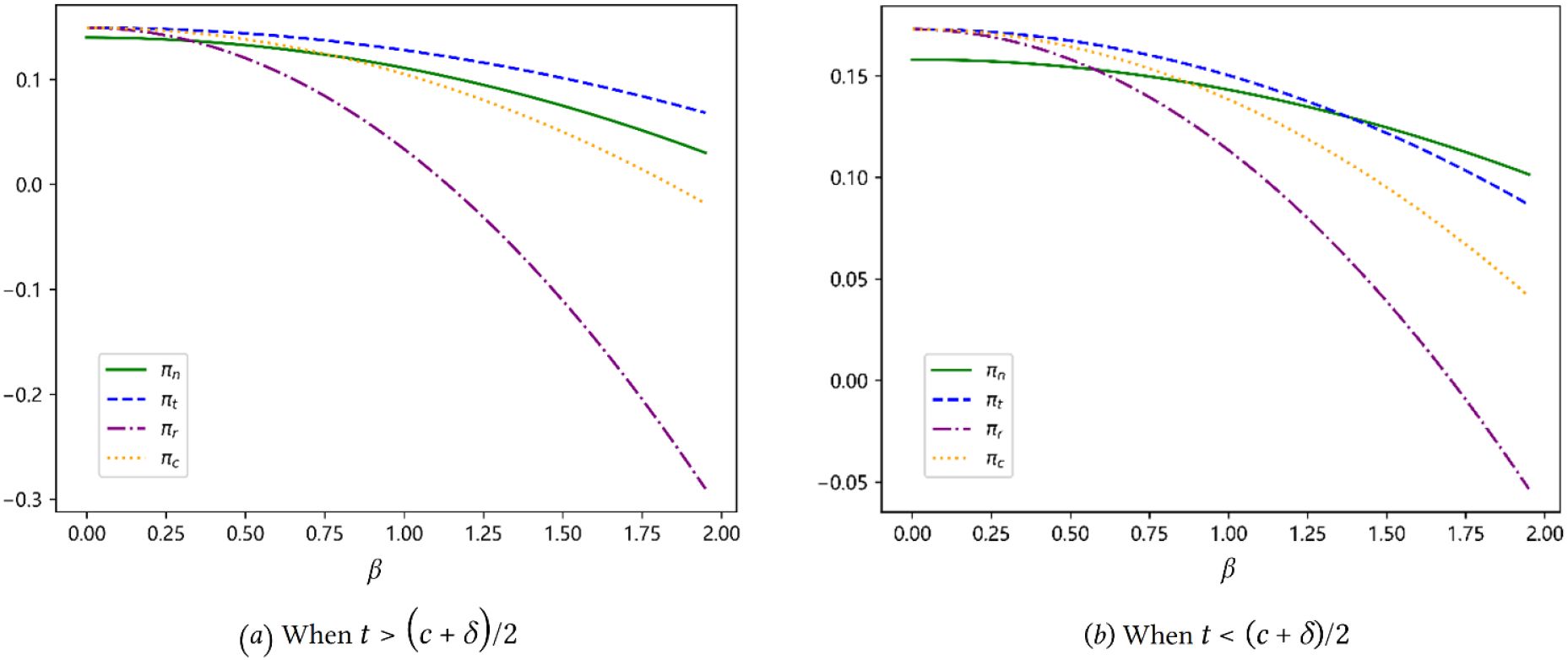 First, we consider the impact of demand sensitivity on CSLs’ profits by examining how different cooperation mechanisms perform under varying levels of . In the numerical analysis presented in Figure 2, when there is no service competition between the CSLs (i.e., ), all three slot–sharing agreements outperform the no–sharing scenario. This occurs because slot sharing mitigates inventory risks without exacerbating market competition, leading to higher profits. As increases, service competition under revenue–sharing and cost–sharing contracts intensifies rapidly, causing profits to drop below those under no slot sharing when is high. In Figure 2A, since , The relatively high transfer price under the transfer–payment contract mitigates the intensification of market competition, thereby keeping profits at a level higher than that in the no–sharing scenario. However, in Figure 2B, since , the relatively low transfer price in the transfer–payment contract encourages CSLs to be more proactive in securing cargo, thereby intensifying market competition. Consequently, the rise in service costs may exceed the benefits derived from reduced inventory risk through slot sharing. Therefore, when the degree of service competition is high, the profits under the transfer–payment agreement may even be lower than those without slot sharing.