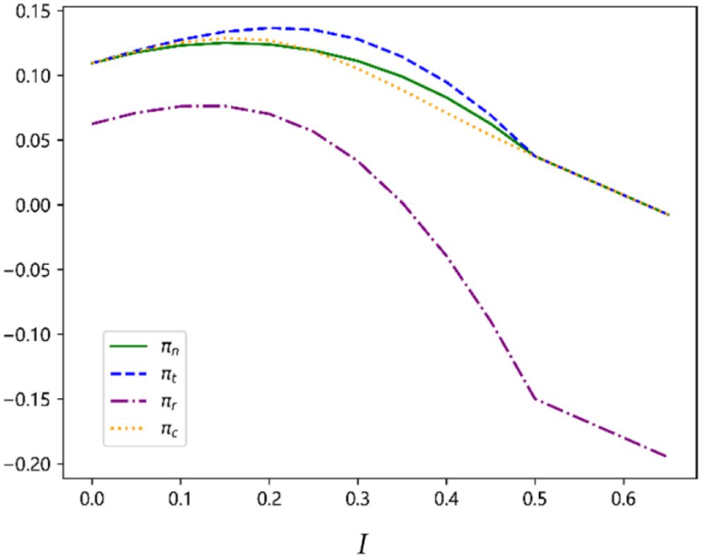 Next, we examine the impact of unit slot delay compensation on CSLs’ profits. As shown in Figure 3, with an increase in unit compensation, CSLs become more cautious in securing cargo. This caution weakens market competition, reduces service quality levels, and ultimately lowers costs and boost profits. Especially for CSLs under the revenue–sharing agreement, as the unit compensation increases, the profit from unfulfilled excess demand (i.e., ) decreases. Consequently, the cost savings from lowering service quality levels exceed the reduced profit from unfulfilled excess demand. This leads to a rapid mitigation of previously intense market competition and a significant profit increase. However, under other slot–sharing agreements, although CSLs become more cautious in cargo securing, thereby decreasing service quality levels and saving costs. The cost savings may slightly exceed the reduced profit from unmet excess demand and consequently, the overall change in profit remains negligible.