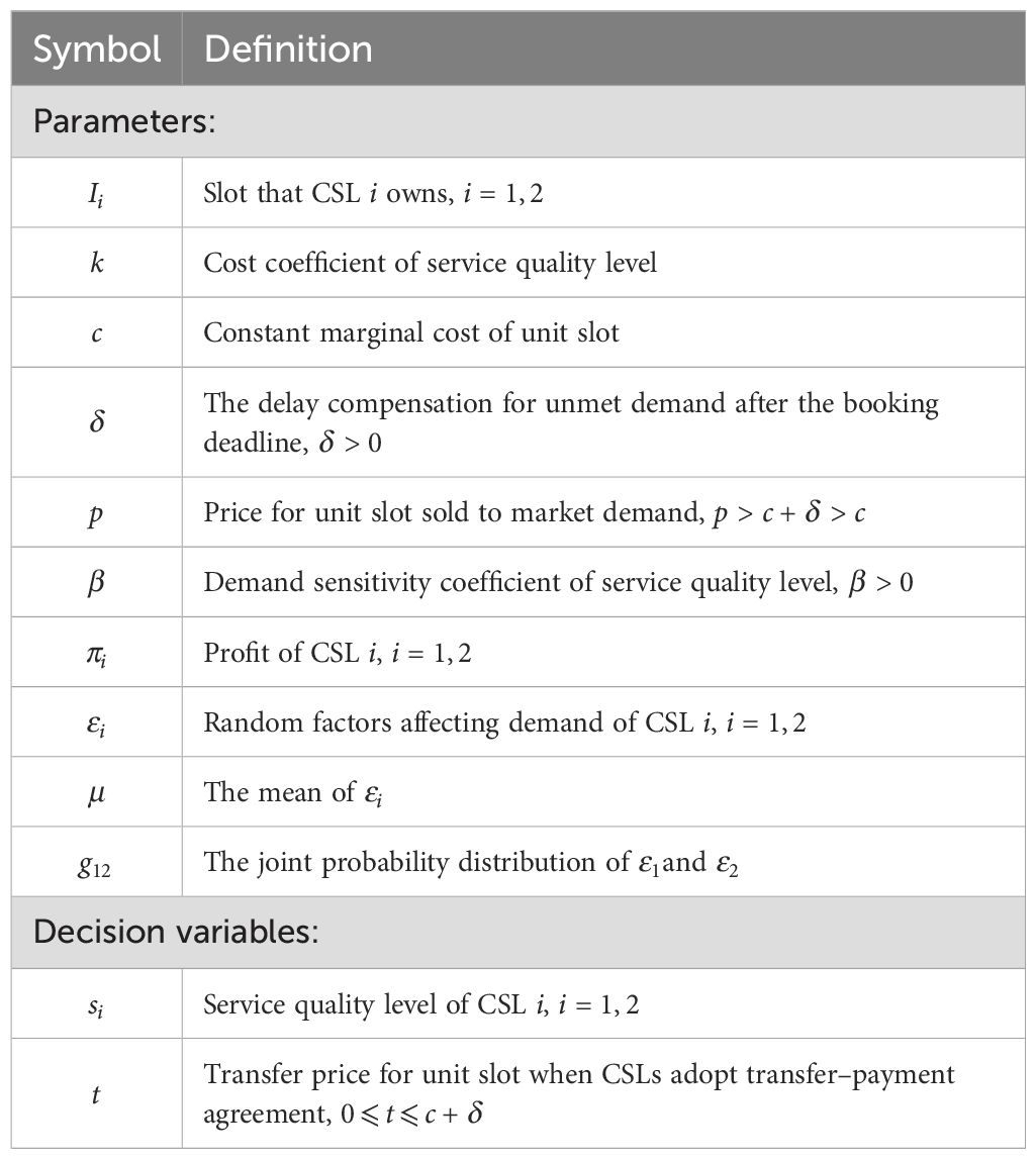 To address these questions, we consider two CSLs engage in service competition within a shipping market characterized by uncertain demand. The two CSLs decide whether to reach a slot–sharing agreement with each other and then determine their service quality. We consider three typical slot–sharing agreements between the CSLs, namely, transfer–payment, revenue–sharing, and cost–sharing agreement. After demand uncertainty is realized, slot–sharing based on specific agreement is implemented. Our focus lies in comparing the performance of these three distinct agreements and investigating whether the CSLs should opt for a slot–sharing agreement.