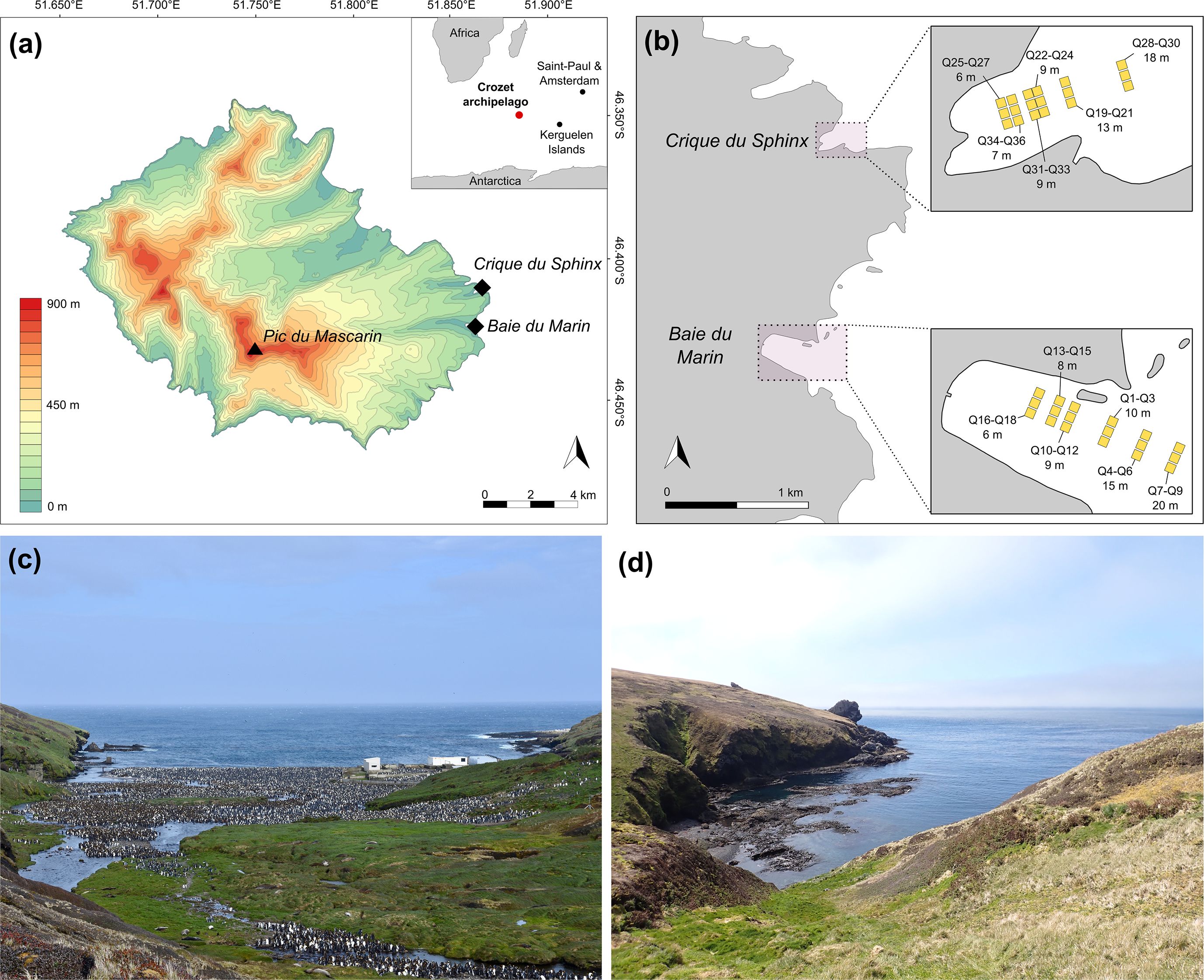 Figure 1. (a) Topographic map of Ile de la Possession, diamonds indicating the location of Baie du Marin and Crique du Sphinx; (b) Faunal sampling (quadrat sampling design) conducted during the HA04-Crozet-2021 campaign; Photographs of (c) Baie du Marin (photo courtesy of L. Hateau); (d) Crique du Sphinx (photo courtesy of T. Saucède).