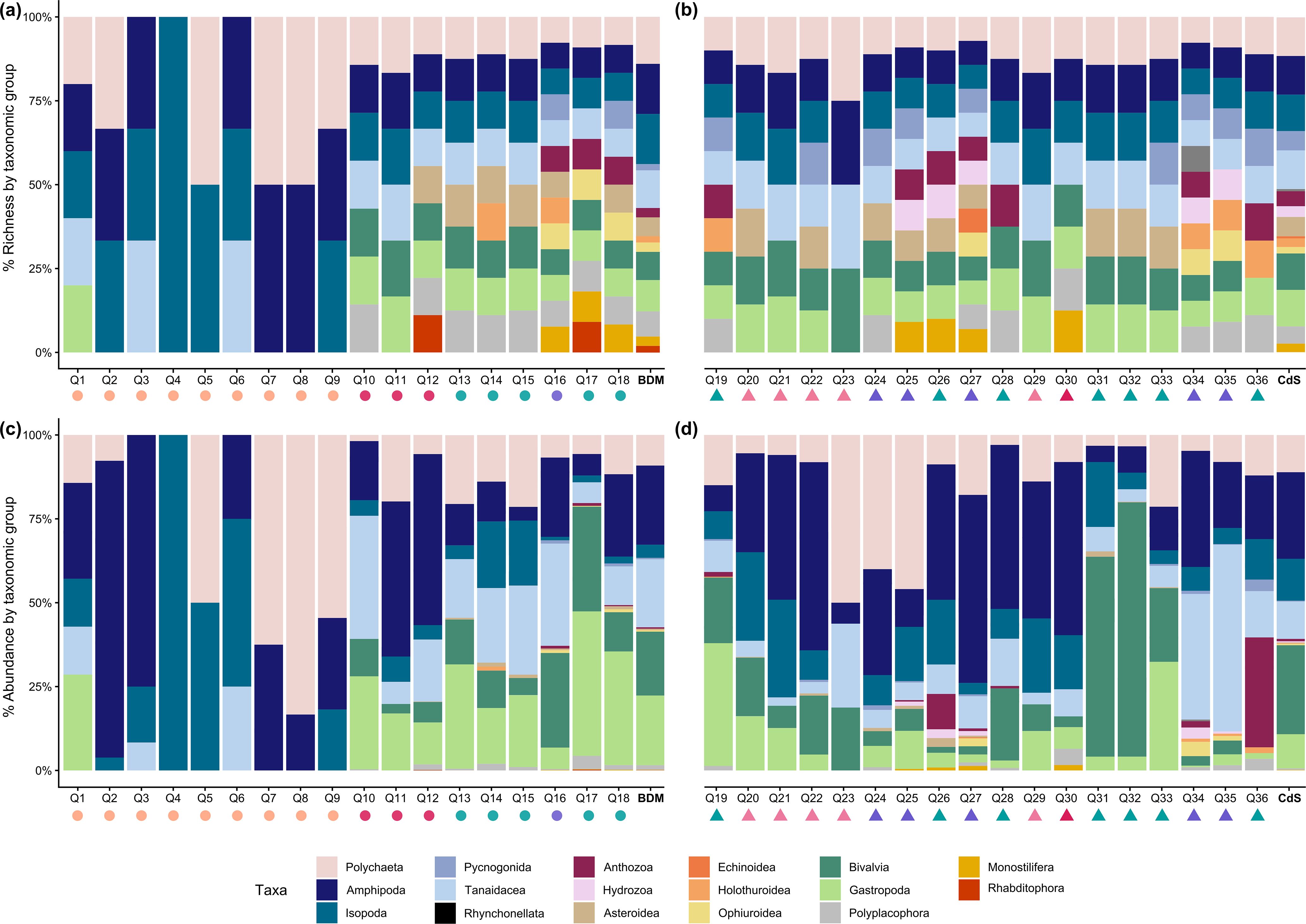 Four stacked bar charts labeled (a), (b), (c), and (d) display taxonomic group data. Each chart shows the percentage of richness or abundance by taxonomic group across various categories labeled Q1 to Q36, BDM, and Cds. Different colors represent specific taxa, with a legend below indicating taxa names like Polychaeta, Amphipoda, and Anthozoa. The charts highlight variations in composition percentages of these groups.