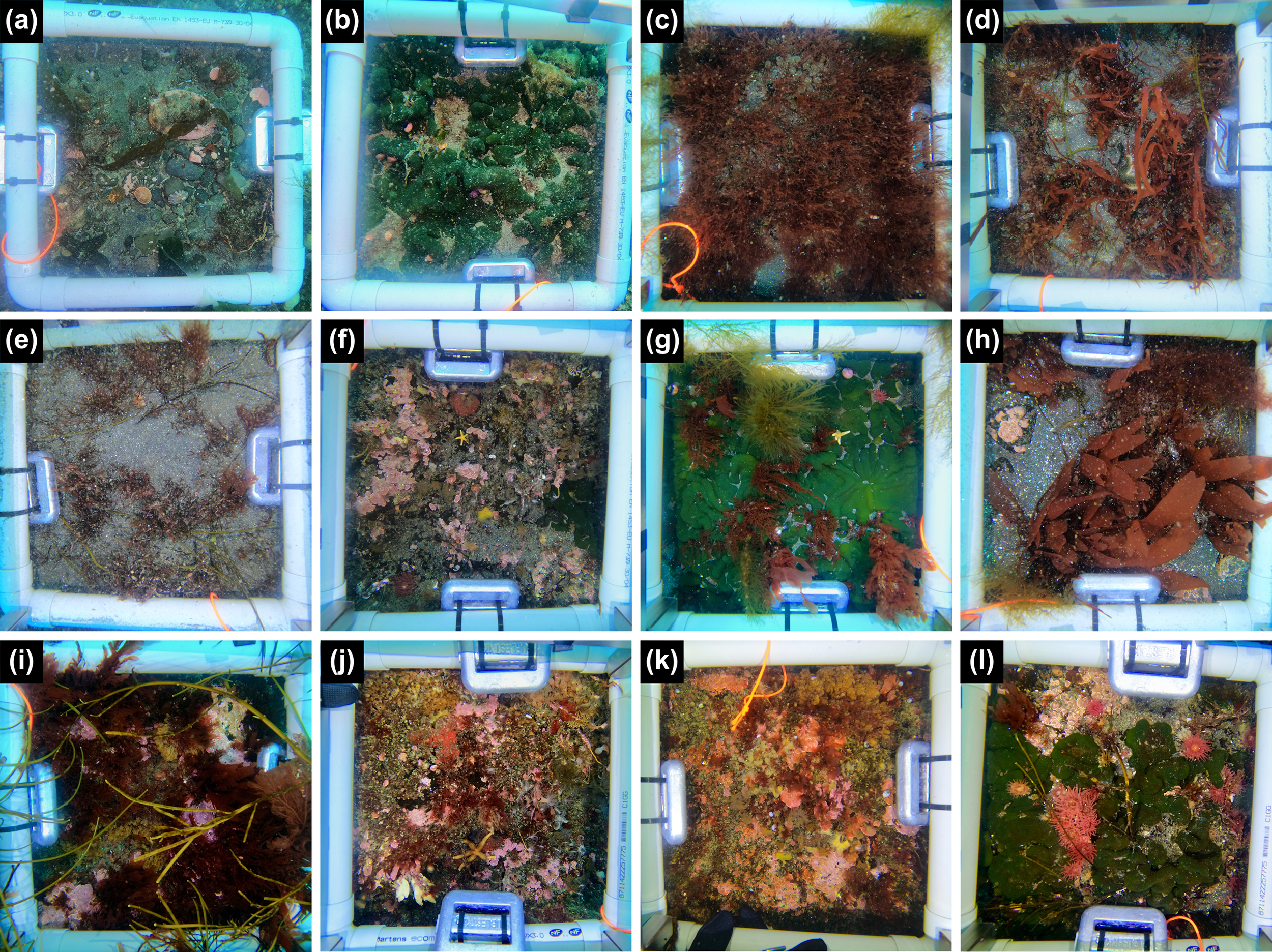 Example of quadrat sampling at Baie du Marin and Crique du Sphinx, with (a) Q11 (sand and pebble substrate); (b) Q13 (rocky substrate dominated by Codium adhaerens); (c) Q20 (sandy substrate dominated by undetermined algae); (d) Q22 (sandy substrate dominated by undetermined algae); (e) Q23 (sandy substrate dominated by undetermined algae); (f) Q27 (rocky substrate); (g) Q28 (rocky substrate dominated by Codium adhaerens); (h) Q30 (sand and pebble substrate); (i) Q32 (rocky substrate dominated by undetermined algae); (j) Q34 (rocky substrate); (k) Q35 (rocky substrate); and (l) Q36 (rocky substrate dominated by Codium adhaerens).