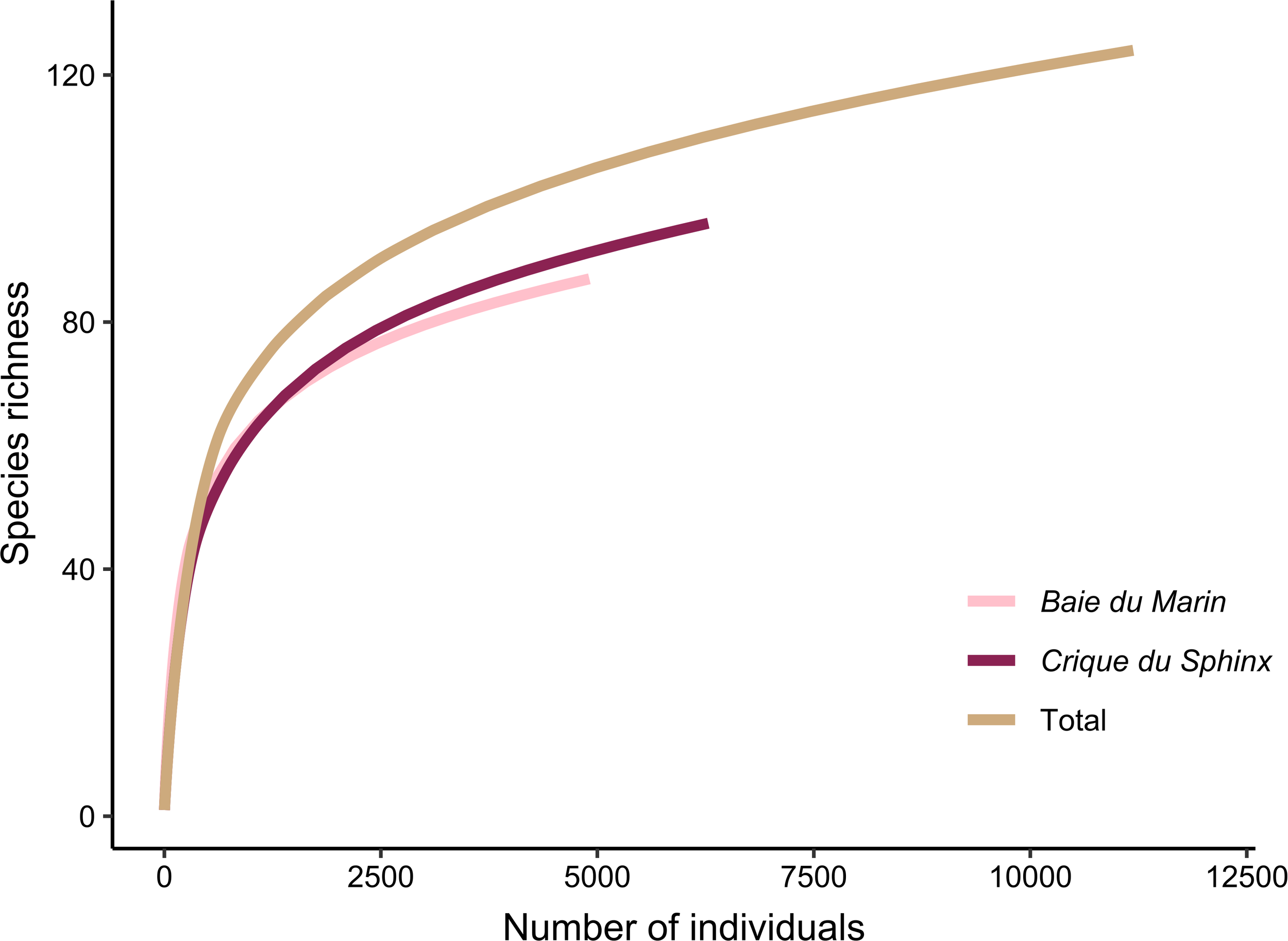 Individual-based rarefaction curves of faunal communities at Baie du Marin and Crique du Sphinx. The brown line (Total) represents the rarefaction curve for both sites combined.
