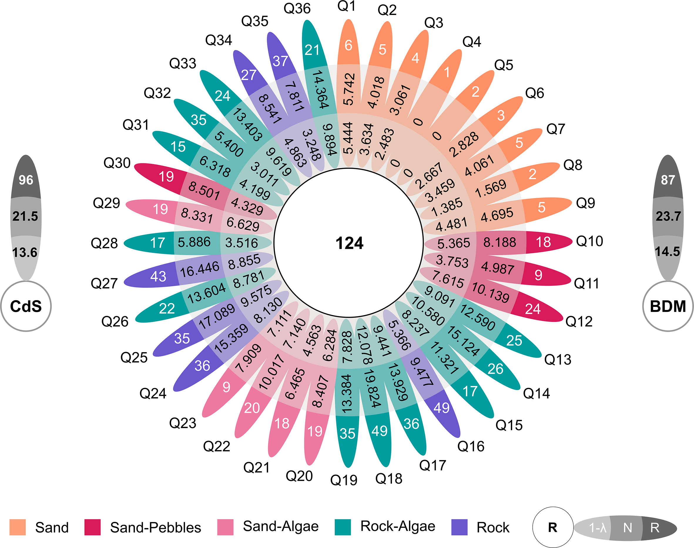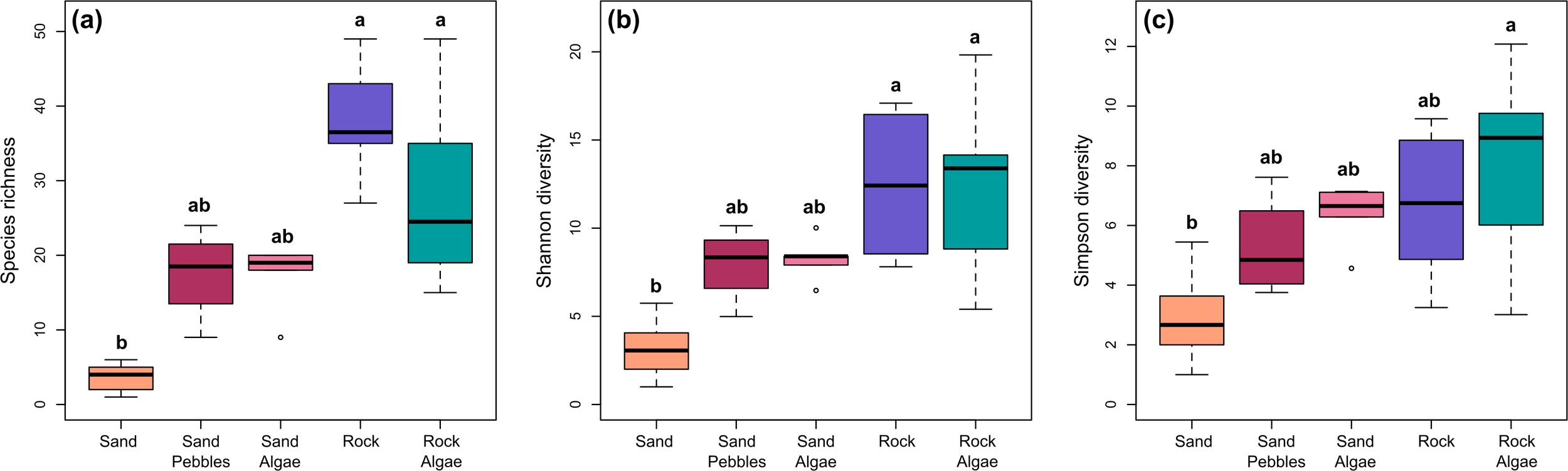 Individual-based rarefaction curves were computed to assess the sampling effort at Baie du Marin, Crique du Sphinx, and across both sites combined. A Principal Coordinates Analysis (PCoA) was performed on Hellinger-transformed abundance data using Euclidean distances to investigate variations in faunal composition among sites and quadrats. Abundance data were Hellinger-transformed to avoid giving an excessive weight to rare species (Legendre and Gallagher, 2001). Univariate Hill’s diversity indices were calculated for each quadrat and each site, including species richness (R; q=0), Shannon diversity (N; q=1) and Simpson’s inverse (1-λ; q=2) (Jost, 2006). For each diversity metric, non-parametric Kruskal-Wallis followed by Dunn’s post-hoc pairwise tests were performed to test for significant differences among the different substrate types, with p-values adjusted using a Bonferroni correction. Commonness and rarity were categorized from both species abundance and occurrence. Morphotypes were defined as: rare (average number of individuals per quadrat ≤1 and occurring in ≤9 quadrats out of a total of 36 (i.e., ≤25% of quadrats); common (average number of individuals per quadrat ≥2 and occurring in ≥27 quadrats (i.e., ≥75% of quadrats); or moderate (everything else) (Hewitt et al., 2016). All statistical analyses were performed using R software (version 4.2.0, R Core Team 2022). Rarefaction curves were conducted using the package iNEXT (Hsieh et al., 2016). Diversity indices and PCoA were conducted using the vegan package (Oksanen et al., 2013).