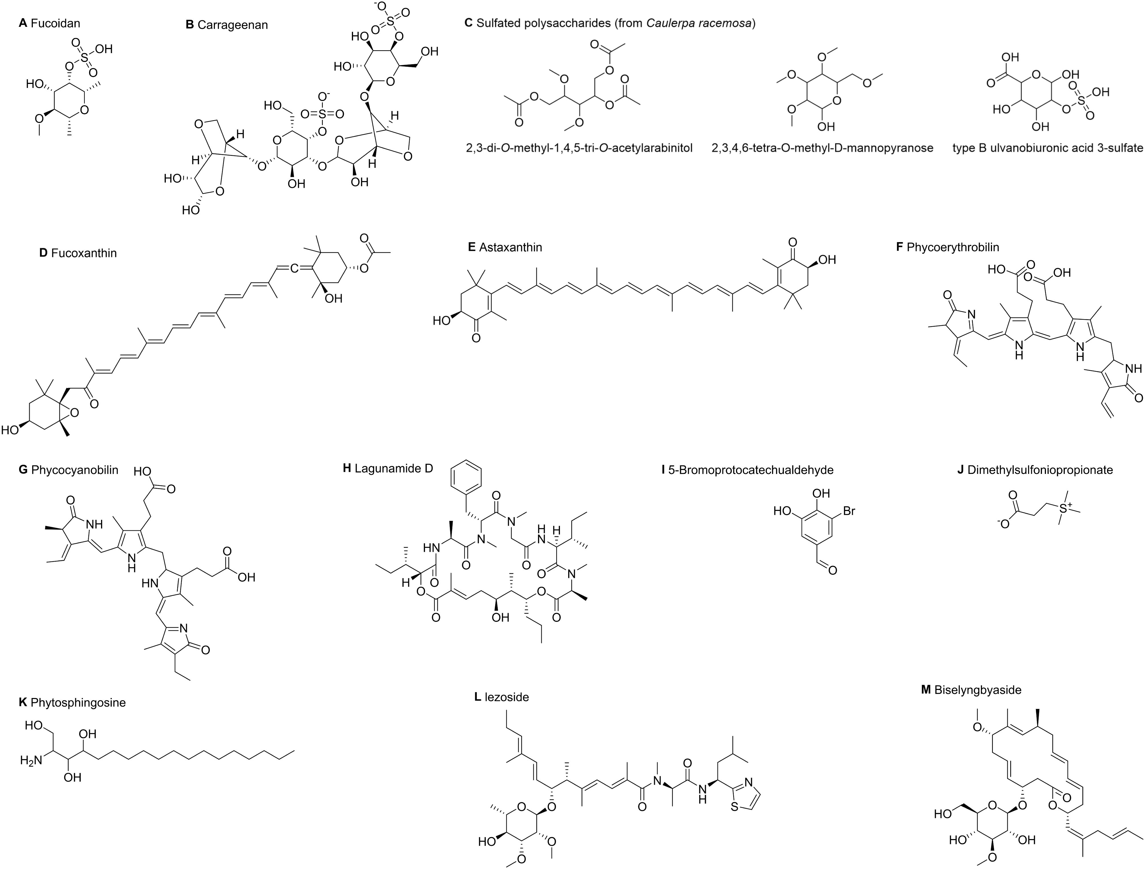 Figure 2. The planar structure of marine algal compounds. This image shows the planar molecular structures of key marine algal compounds in this study. (A) Fucoidan; (B) Carrageenan; (C) Characteristic monosaccharide/oligosaccharide units from the sulfated polysaccharides of Caulerpa racemosa; (D) Fucoxanthin; (E) Astaxanthin; (F) Phycoerythrobilin, the characteristic chromophore of phycoerythrin; (G) Phycocyanobilin, the characteristic chromophore of C-phycocyanin; (H) Lagunamide D; (I) 5-Bromoprotocatechualdehyde; (J) Dimethylsulfoniopropionate; (K) Phytosphingosine; (L) Iezoside; (M) Biselyngbyaside. These structures were obtained from PubChem and visualized using ChemDraw (v23.1.1).