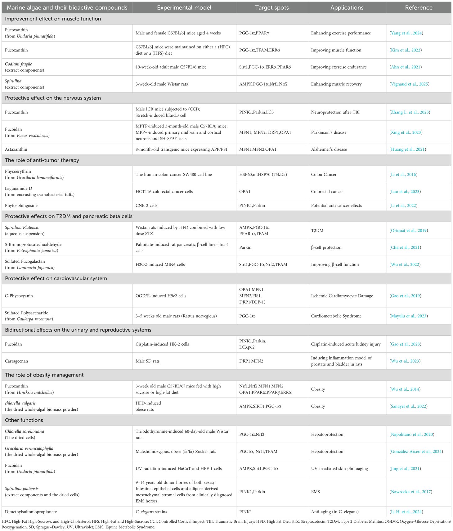 Research has shown that dietary supplementation with 1% dry Chlorella sorokiniana can affect the key regulatory factors of thyroid hormone-induced mitochondrial biogenesis, maintain mitochondrial function, prevent the increase of indicators of oxidative damage and foundational metabolic expenditure, and effectively reduce hyperthyroidism-induced liver oxidative damage in hyperthyroidism rats (Napolitano et al., 2020). González Arceo et al. find that dietary supplements of Gracilaria vermiculophylla can reduce the concentration of non esterified fatty acids in the liver, improve oxidative stress and inflammatory parameters, and ultimately exerting a protective effect in the liver by inhibiting de novo fat synthesis and promoting mitochondrial biogenesis in Zucker fa/fa obese rats (González-Arceo et al., 2024). At the same time, Jing et al.’s study demonstrates that fucoidan purified from Undaria pinnatifida can promote mitochondrial biogenesis induced by ultraviolet radiation in HaCaT cells, alleviate mitochondrial dysfunction, inhibit ROS production, and ultimately protect against UV induced skin photoaging (Jing et al., 2021). Concurrently, some studies on other animals may provide potential value for the prevention and treatment of related clinical diseases. For example, studies have found that horses fed Spirulina platensis-supplemented feed experienced weight loss and improved insulin sensitivity. Further research has confirmed that Spirulina platensis extract can regulate mitophagy, thereby reducing mitochondrial dysfunction, cellular oxidative stress, and inflammation, and promoting the morphological and functional recovery of ADSCs and IECs derived from individuals with metabolic syndrome (Nawrocka et al., 2017). The research results support that Spirulina platensis can be a promising method for routine treatment of equine metabolic syndrome. Similarly, DMSP can significantly upregulate the expression of autophagy and mitophagy related genes, reduce mitochondrial content while improving mitochondrial function in aged C. elegans, thereby delaying the physiological aging process of C. elegans, demonstrating its potential value in promoting longevity and preventing aging (Li H. et al., 2024).