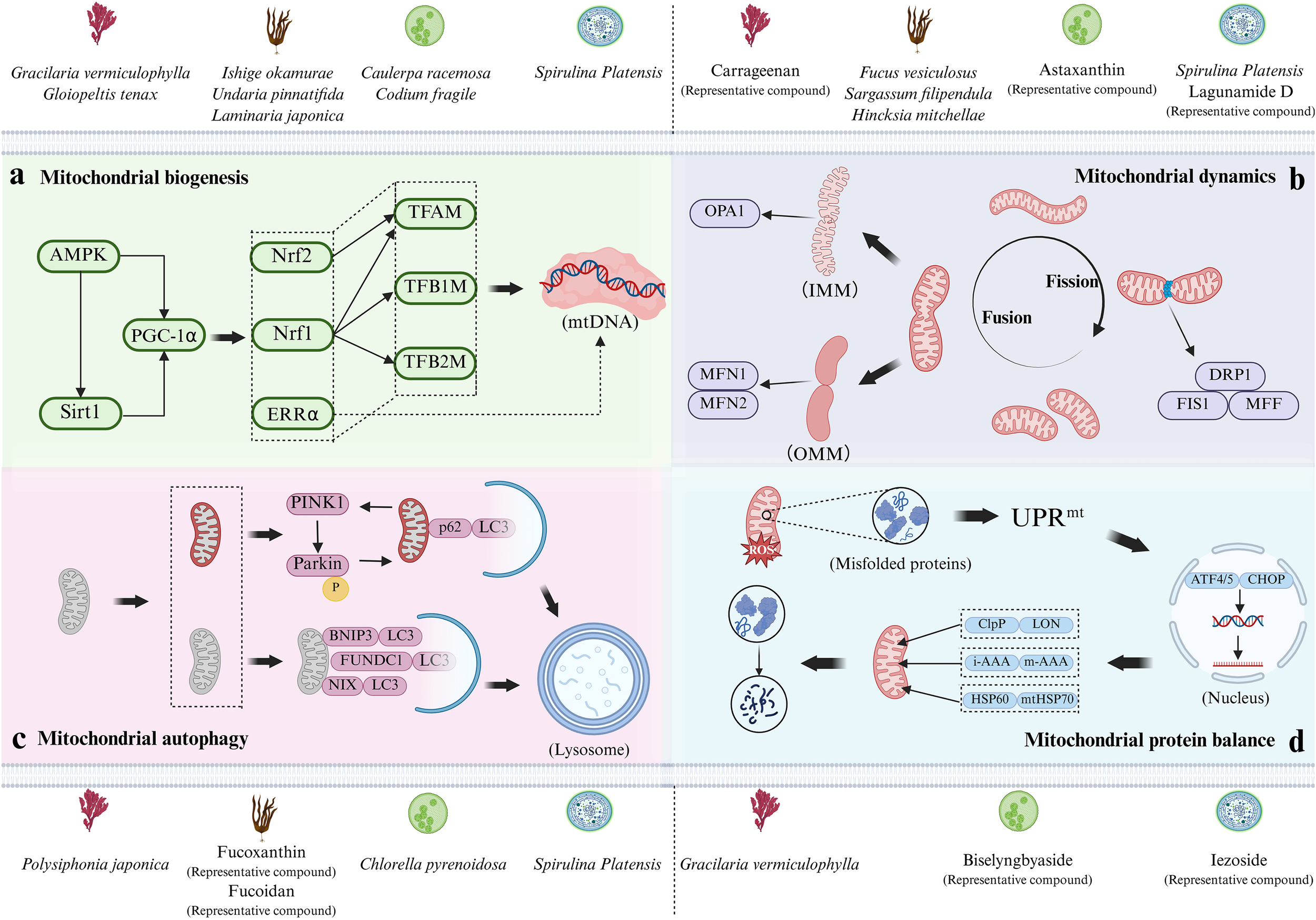 In addition to the aforementioned studies, brown algae polyphenols extracted from Ishige okamurae, sulfated polysaccharides extracted from Caulerpa racemosa, and extracts from Codium fragile and Gloiopeltis tenax have also been shown to enhance mitochondrial biogenesis (Ahn et al., 2021; Hyun et al., 2023; Mayulu et al., 2023; Kim et al., 2024).