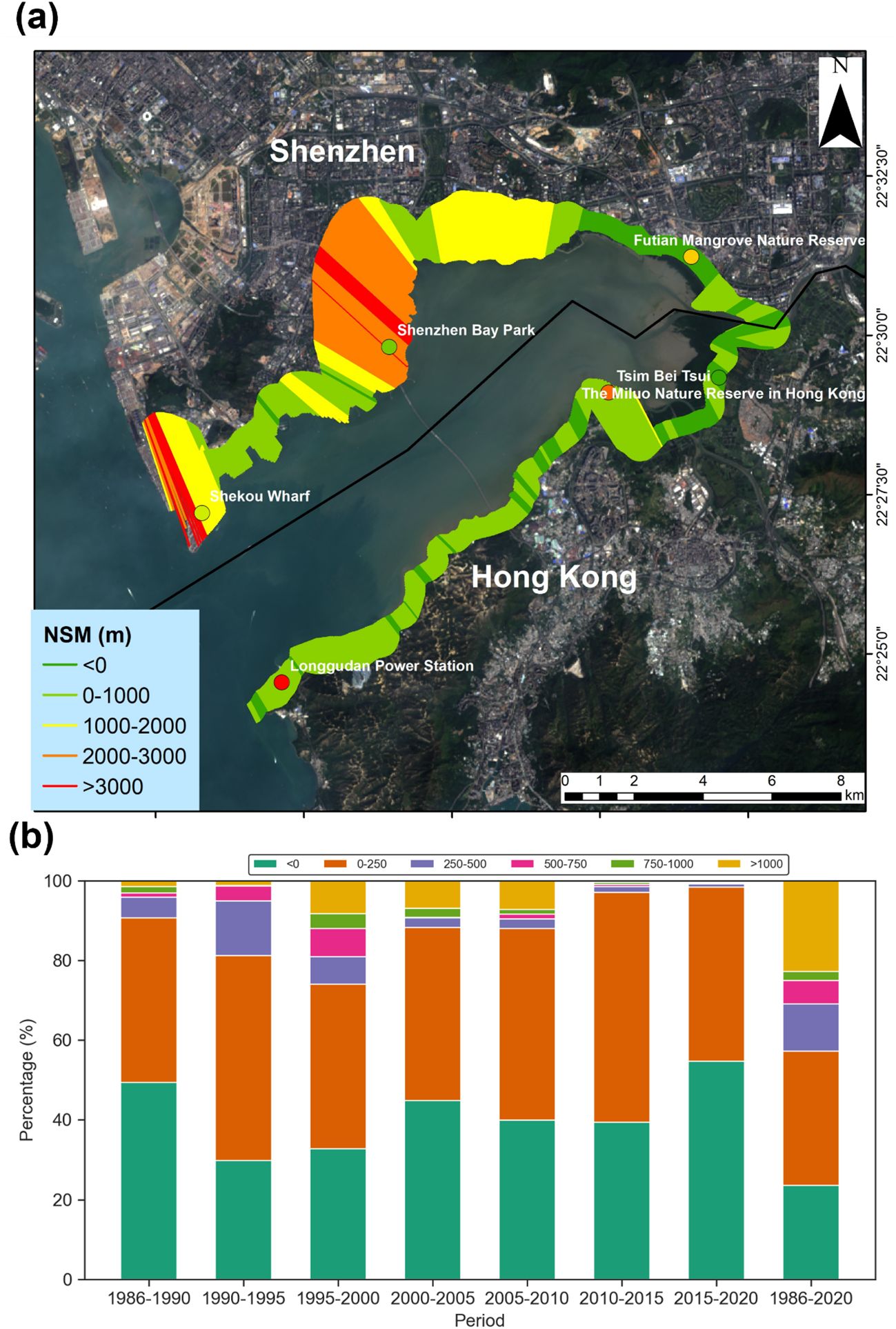 We calculated shoreline change in the direction of transects over the research period including 8 periods by DSAS model (Figure 6). Herein NSM between 1986 and 2020 are analyzed in detail, as shown in Figure 6. The NSM metric reveals that accretion dominated the bay's morphological evolution, with distinct spatial and administrative variations. As seen in Figure 6a, accretion was the main change mode of shoreline over the past 35 years. Statistical analysis of shoreline changes revealed that 76.6% of transects exhibited seaward progression (comprising 53.7% with moderate accretion [0–1000 m], 21.2% showing significant advancement [1000–3000 m], and 1.6% displaying extreme progradation [>3000 m]), while 23.4% experienced landward retreat. The NSM values exhibited pronounced spatial gradients. The Shenzhen sector exhibited pronounced coastal progradation with a mean NSM of 965.13 m, featuring distinct accretion hotspots at Shekou Wharf (NSM > 3000 m) and Shenzhen Bay Park (2000–3000 m) that directly correlate with intensive land reclamation projects. The Hong Kong sector demonstrated minimal coastal displacement (mean NSM = 81.65 m), maintaining stable configurations in protected zones that reflect its conservative coastal management approach.