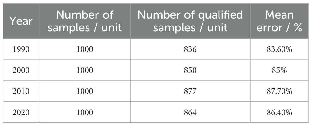 To evaluate the accuracy of shoreline extraction from Landsat imagery, this study randomly selected four epochs of high-spatial-resolution (5 m) Google Earth images from the years 1990, 2000, 2010, and 2020. Shorelines extracted from these images were compared with those derived using the MNDWI method in this research. The DSAS model was employed to generate evenly spaced transects perpendicular to the shoreline. The distance difference between the two sets of shorelines on the same transect was calculated and used as the extraction error. According to Hou et al. (2014) the theoretical maximum permissible error for shoreline extraction from 30 m resolution remote sensing imagery is 28.28 m. An error smaller than this value indicates that the interpretation accuracy at that transect meets the required standard. Based on this criterion, Table 2 shows that the qualification rates for all four studied years in the research area exceeded 83%, confirming that the interpretation accuracy satisfies the requirements.
