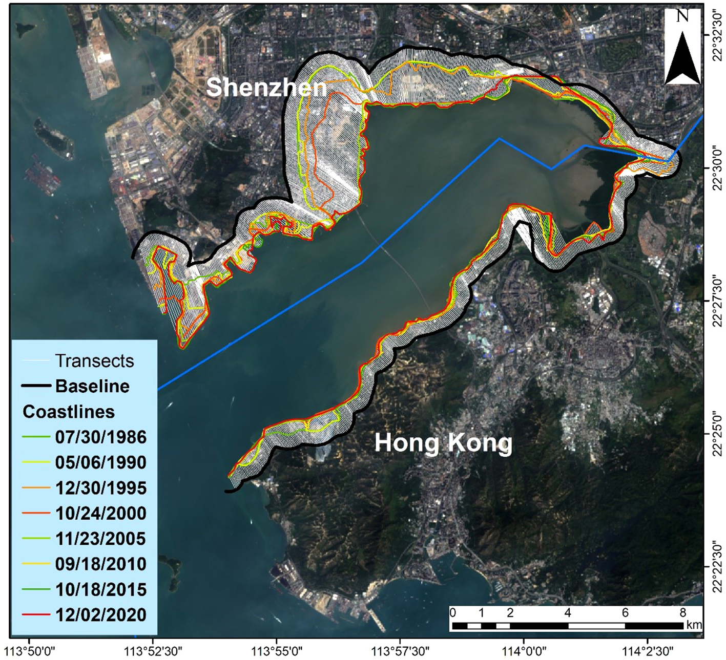 As a rapidly developing core city in China’s Pearl River Delta region, Shenzhen has been the focus of numerous studies examining coastal transformation in recent years. Previous research has revealed significant spatiotemporal variations in Shenzhen's shoreline evolution under intense anthropogenic pressure. Li et al. (2009) found that the length of Shenzhen shoreline increased first and then decreased from 1978 to 2005, with human activities identified as the dominant driver. Through analysis of Landsat imagery and four shoreline evaluation indices, Wei et al. (2023) reported continuous shoreline extension from 1979 to 2019, accompanied by rapid proliferation of artificial shorelines. Gao and Zeng (2012) employed Landsat TM data to analyze and project the shoreline changes in Shenzhen from 1986 to 2020, revealing pronounced spatial disparities with more intensive modifications occurring in western sectors compared to eastern areas, along with substantial land reclamation exceeding 74 km² that was projected to reach 108.9 km². The shoreline of Hong Kong underwent rapid expansion from 1989 to 2021, with the intensity of shoreline change peaking at 1.47% during 2004–2009 (Yi et al., 2023). Over the periods 1991–2000, 2000–2011, and 2011–2018, the shoreline increased by 11.30 km, decreased by 1.81 km, and increased by 1.44 km, respectively, reflecting a gradually decelerating trend in the rate of change (Zhan et al., 2021). The reclaimed land in Hong Kong has been expanding over the past decades, with increases of 10.93 km² and 18.39 km² during the periods 1989–1994 and 1999–2004, respectively. However, the expansion rate has slowed in recent years, reaching only 5.21 km² between 2016 and 2021 (Yi et al., 2023).