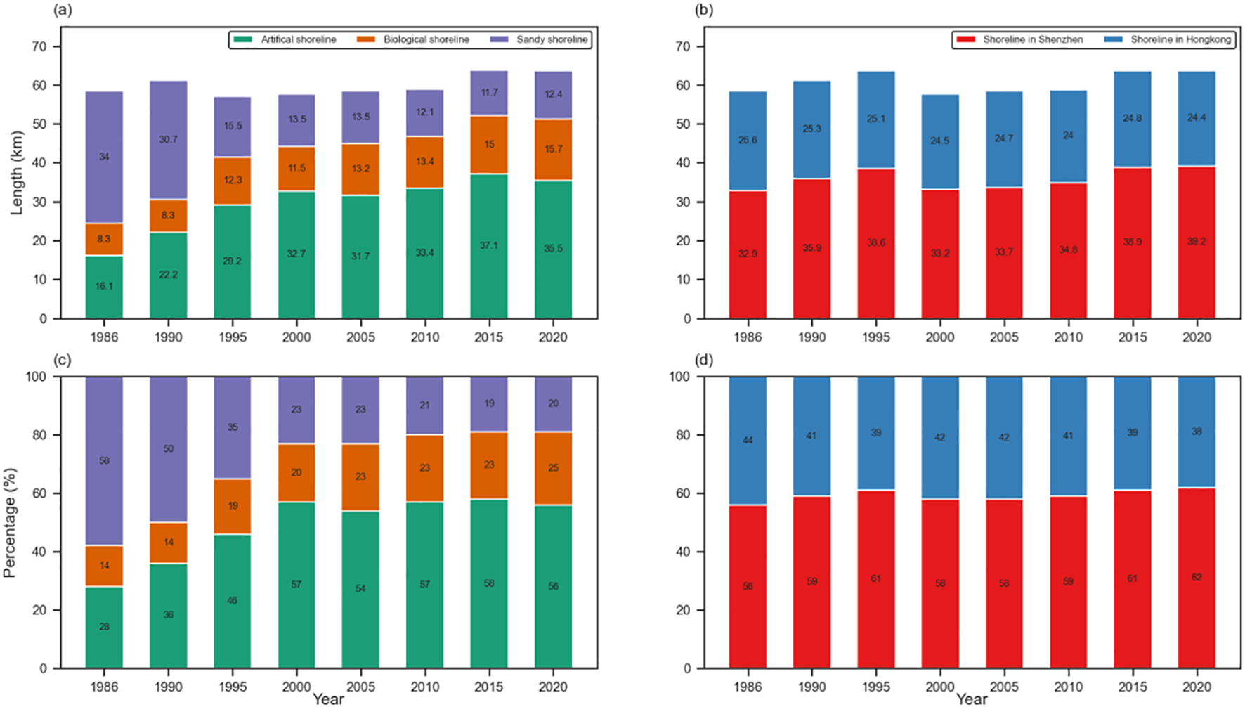 Marked differences in shoreline dynamics were observed across administrative boundaries. During 1986–2020, in Shenzhen sector, the shoreline length displayed aggressive coastal advancement by 0.57 km/a and the proportion of the shoreline in Shenzhen increased from 56% to 62%, ranking among the most rapidly modifying urban shorelines globally (Figure 4d). During 1986–2020, in Hong Kong sector, the shoreline length showed marginal retreat by -0.17 km/a and the proportion of the shoreline in Hong Kong decreased from 44% to 38% (Figure 4b).