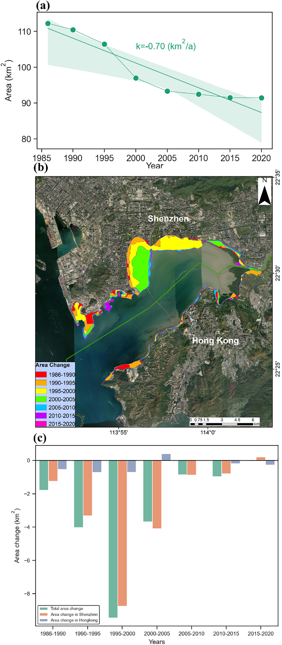 Figure 5 presents a comprehensive quantification of the spatiotemporal changes in Shenzhen Bay's surface area from 1986 to 2020. The analysis reveals a statistically significant reduction in total bay area, decreasing from 112.24 km² to 91.45 km² over the 35-year study period, representing an average annual loss of 0.70 km²/a (Figure 5a). In the Shenzhen sector, the most pronounced modifications occurred in two key locations: Shekou Wharf area which characterized by progressive seaward expansion for port infrastructure development and Shenzhen Bay Park vicinity due to systematic land reclamation for urban recreational space (Figure 5b). Conversely, the Hong Kong sector demonstrated more localized changes, concentrated in: Tsim Bei Tsui which exhibiting moderate shoreline adjustments and Longgudan Power Station area due to display limited but measurable modifications.
