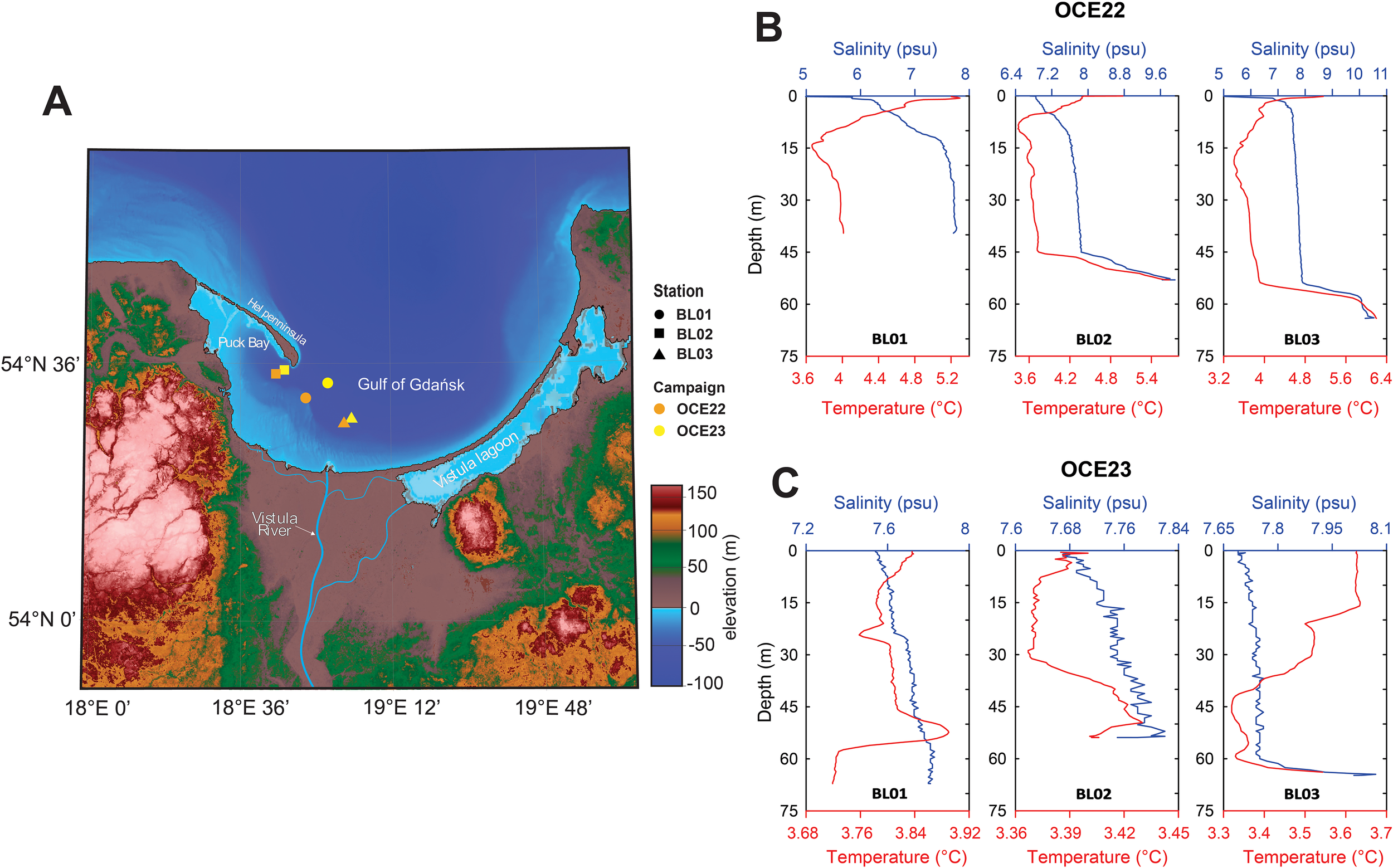 (A) Map showing the location of sampling stations in the Gulf of Gdańsk from two campaigns, OCE22 and OCE23. Salinity (psu), temperature (°C), and depth profiles measured in March 2022 (B) and March 2023 (C), with temperature in red and salinity in blue.