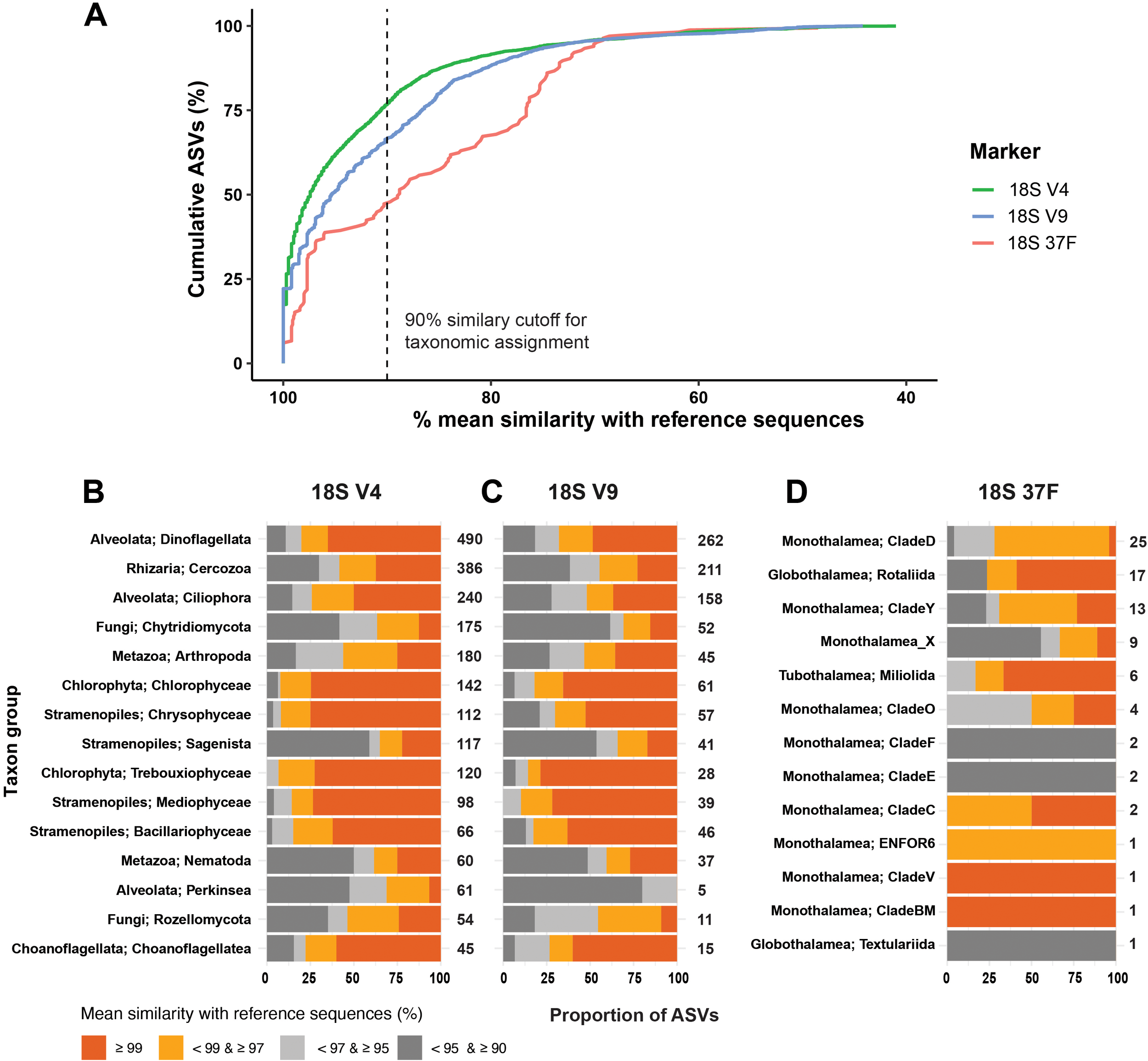 (A) Cumulative proportion of ASVs as a function of their mean similarity with the reference sequence. The vertical dash lines indicate the similarity cutoff (90%) for taxonomic assignment used in this study. Corresponding taxonomic assignment summaries are presented as barplots for 18S-V9 (B), 18S-V4 (C), and 18S-37F (D) with a three-level cutoff.