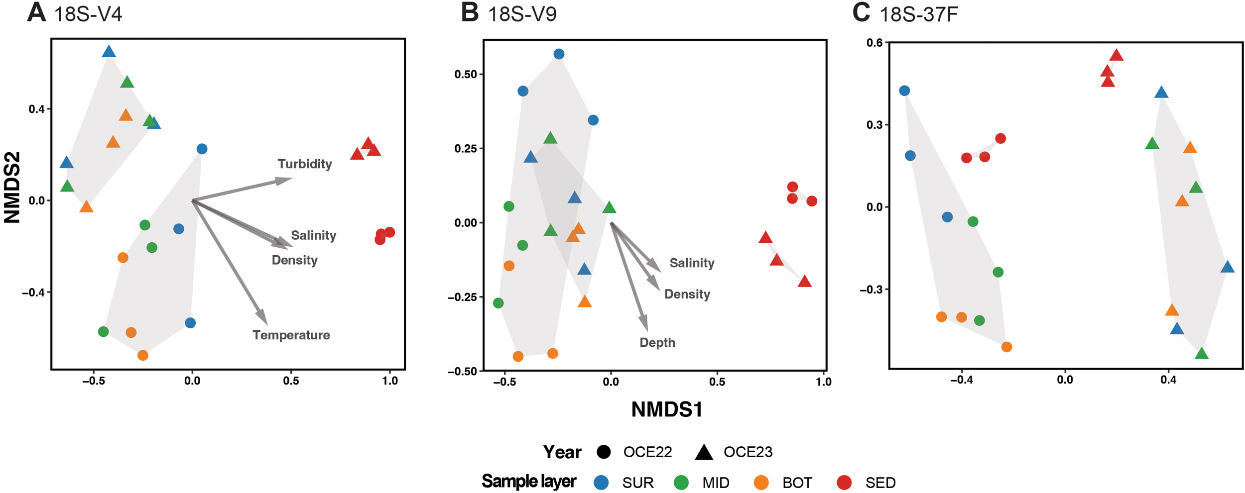 Analysis of community beta diversity was conducted using the nMDS method based on Bray–Curtis distance similarity coefficient (Figure 6). Eukaryotic communities were clearly differentiated between water and sediment samples, with distinct clustering patterns observed across the three markers. These patterns were supported by non-parametric PERMANOVA tests (p < 0.001), showing significant effects for V9 (R² = 0.40, F = 14.83), V4 (R² = 0.33, F = 11.17), and 37F (R² = 0.12, F = 3.2). Dispersion analysis also revealed significant differences among sample types in different markers (ANOVA, p <0.001), whereas variation of two campaigns was not significant. The communities of sediment samples formed tight clusters within each campaign, while those of the waters showed higher variability. In the V9 dataset, water samples from different campaigns overlapped substantially, whereas those in the V4 dataset were distinctly separated. In the 37F dataset, community composition estimates were not only highly differentiated between water and sediment samples but also between the two campaigns, i.e., OCE22 and OCE23. The envfit results indicated that salinity and density were the strongest environmental correlates of community turnover in both the V4 and V9 datasets. Additionally, depth showed a strong correlation with community structure in the V9 dataset, while turbidity and temperature were more strongly associated with variation in the V4 dataset. In contrast, no environmental variables were significantly correlated with community patterns in the 37F dataset.