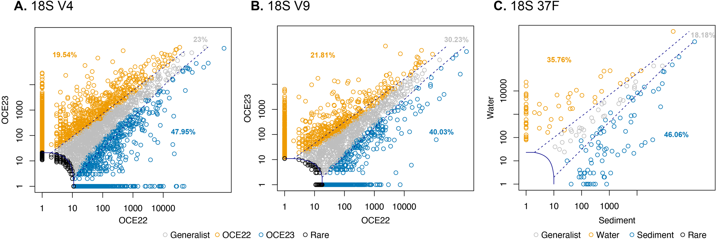 CLAM test results classifying specialist ASVs in eukaryotic communities of OCE22 and OCE23 campaigns, i.e., for 18S-V4 (A) and 18S-V9 (B), and foraminiferal communities of water and sediment samples (C). Summary plot generated by the CLAM test in vegan, showing generalists, specialists, and rare taxa between two conditions tested (i.e., OCE22 vs. OCE23 and water vs. sediments).