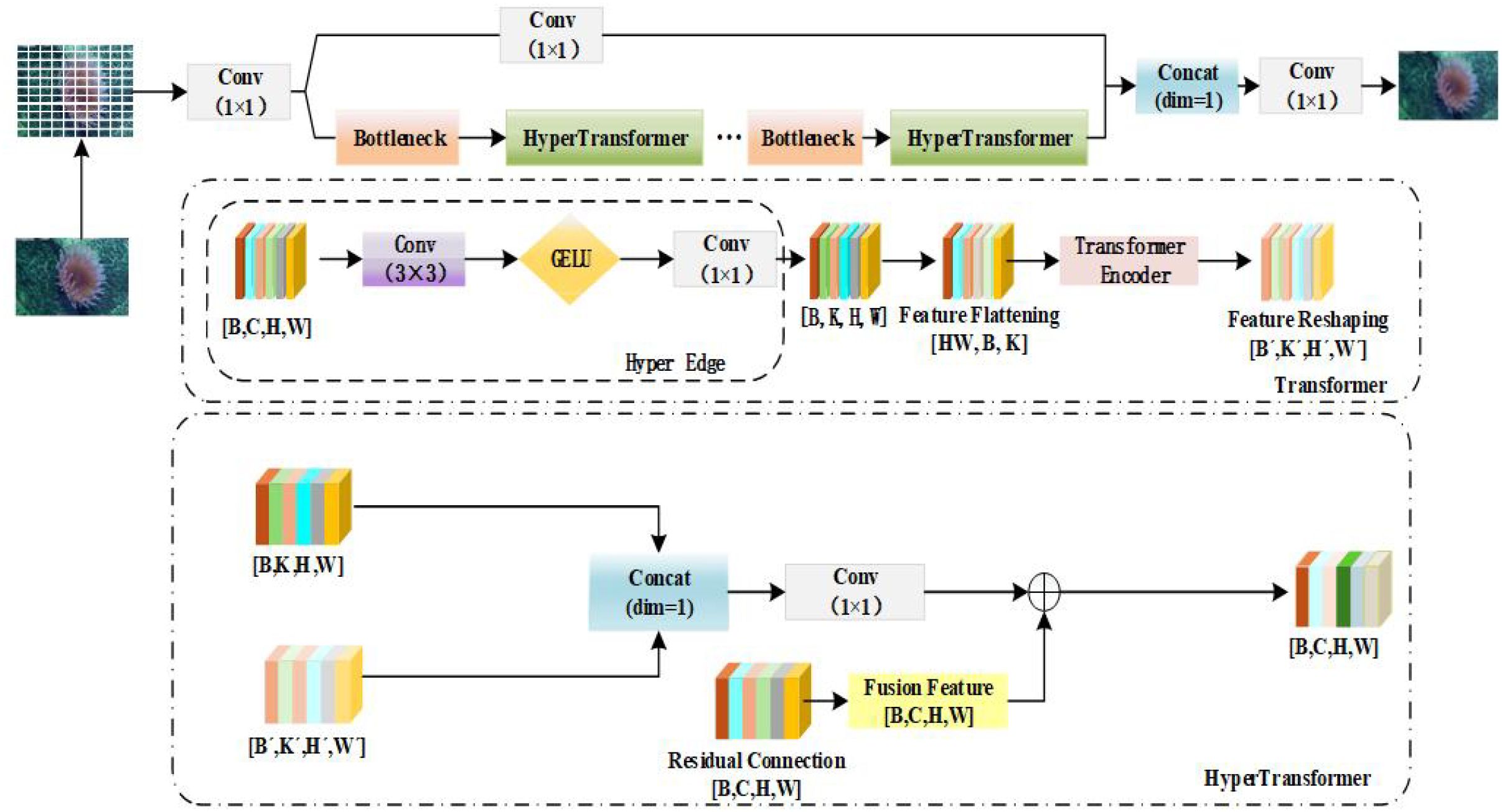 The Hyper Edge feature extraction submodule captures local spatial features through 3×3 convolutions, introduces nonlinear transformations via the GELU activation function (Lee, 2023), and then compresses the feature dimensions to hyper_dim through 1×1 convolutions, thereby retaining key details while reducing the computational complexity of the Transformer. Its feature transformation process is shown in Equation (15).