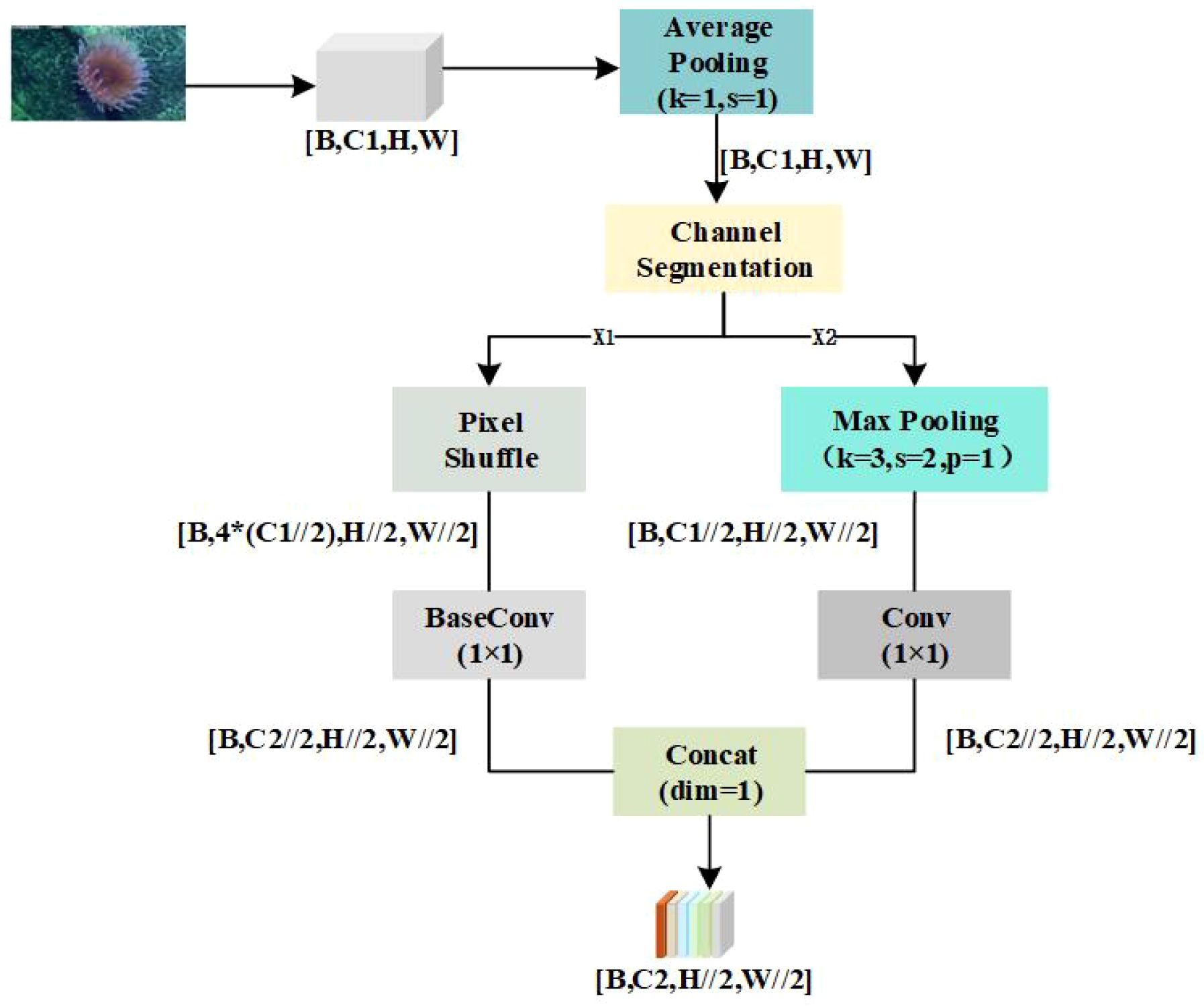 The ADown module is a lightweight downsampling module designed for the characteristics of deep-sea environments such as low illumination, high noise, and blurred targets. This module adopts a dual-path feature parallel processing mechanism, which achieves 2x spatial downsampling while effectively preserving subtle features and edge information in deep-sea biological images. ADown module enhances the representation ability for weak textures and small targets through multi-scale feature fusion, and at the same time controls computational complexity to meet the requirements of practical deep-sea biological image recognition.