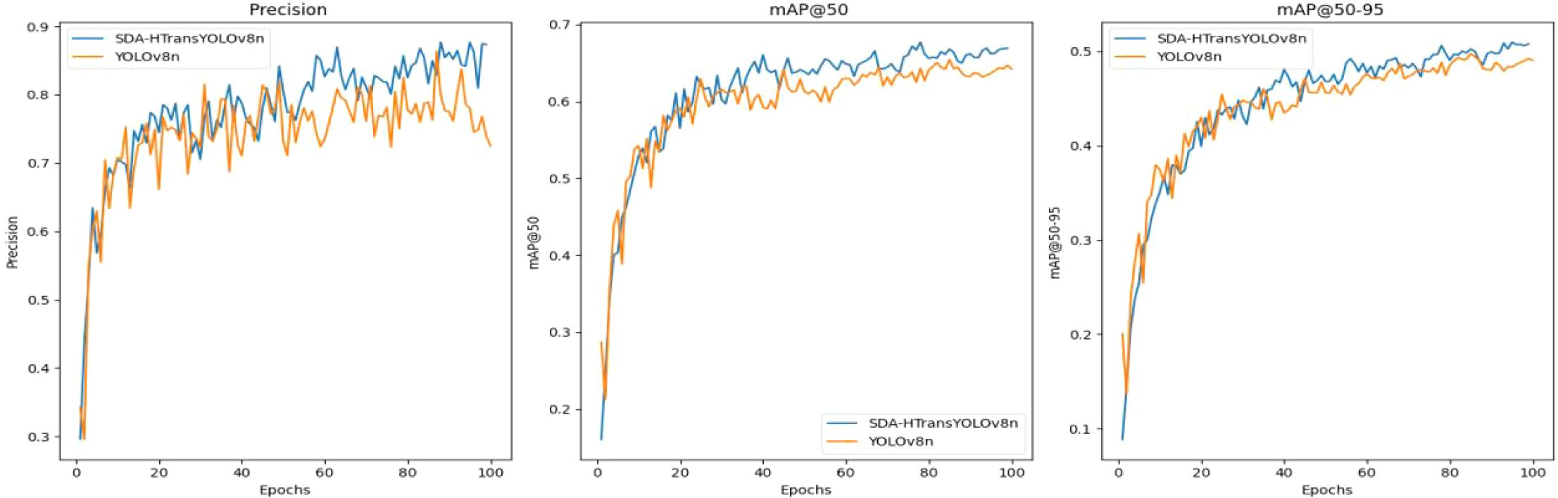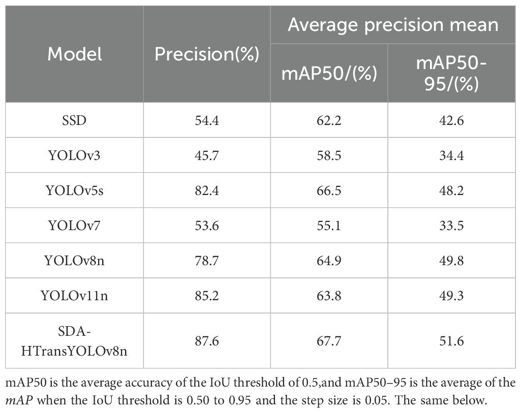 In order to fully evaluate the performance of the SDA-HTransYOLOv8n model, the same dataset is used as a sample and it is analyzed in comparison with a series of target detection models, which include SSD, YOLOv3, YOLOv5, YOLOv7, YOLOv8n, and YOLOv11 five models. The results are shown in Table 3, and SDA-HTransYOLOv8n excels in all performance metrics. Its model reaches 87.6%, 67.7%, and 51.6% in Precision, and mean average precision (mAP50,mAP50-95), respectively, which fully proves its strong ability in accurately identifying and localizing targets.
