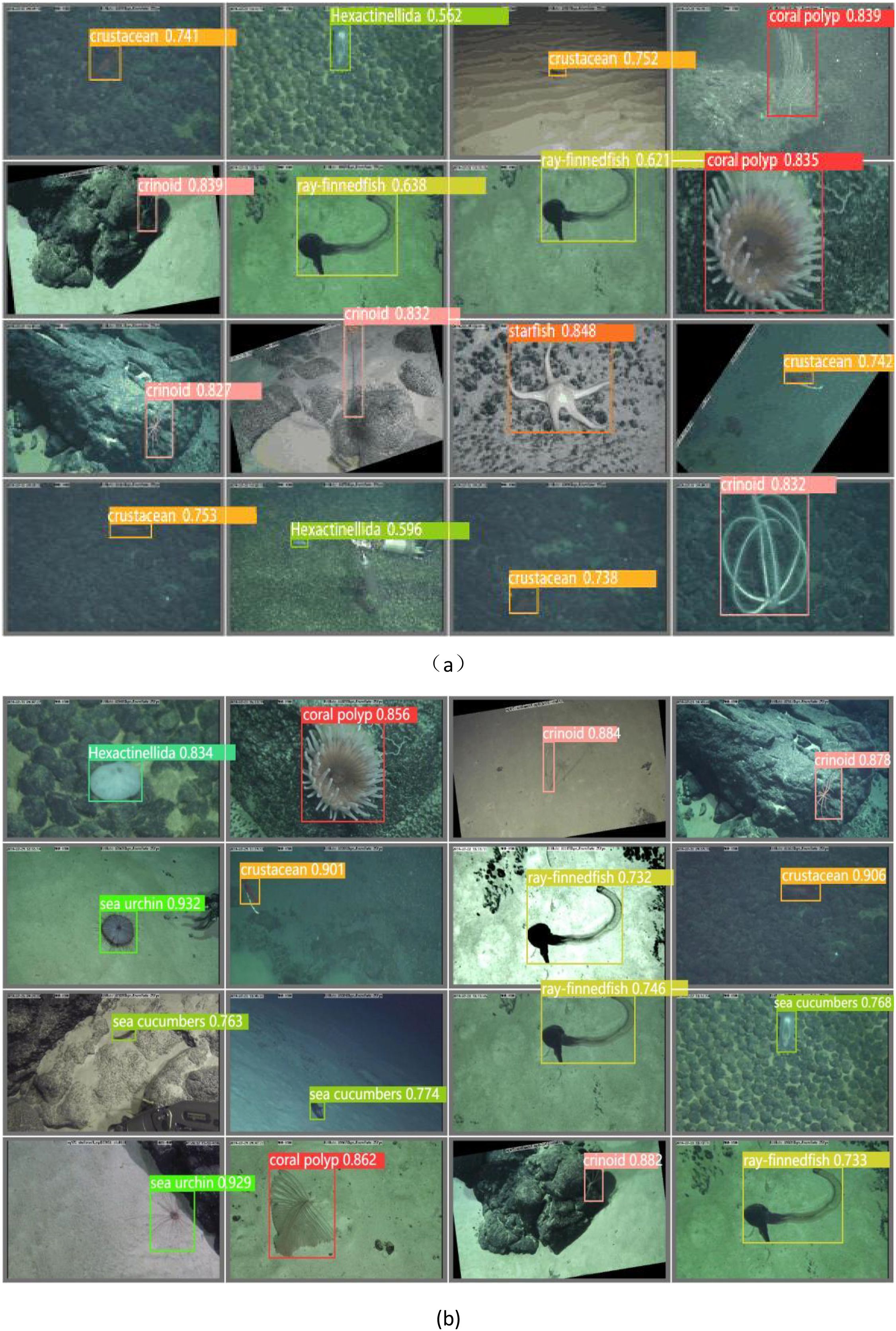 Figure 7. The Jiaolong dataset contains eight phyla of organisms: (a) Coral Polyp; (b) Crinoid; (c) Starfish; (d) Crustacean; (e) Ray-Finned Fish; (f) Sea Urchin; (g) Sea Cucumber; (h) Hexactinellida.