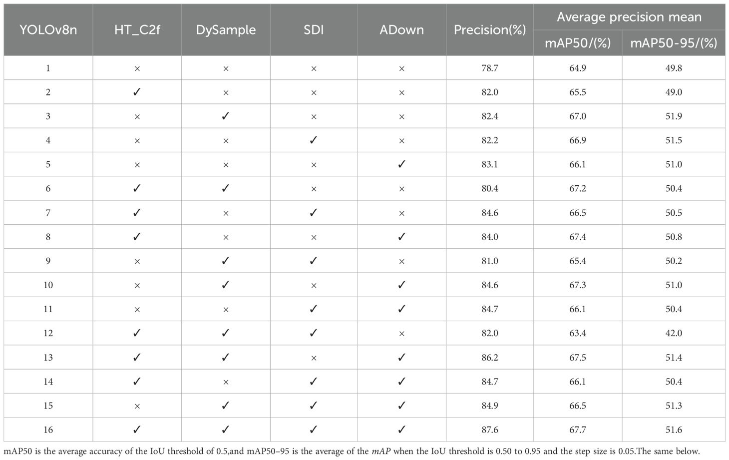 In this study, the performance of the improved YOLOv8n model was evaluated using the precision (Hestness et al., 2019) and mean average precision (mAP) as the evaluation metrics. For details, see Equations (28)–(31).