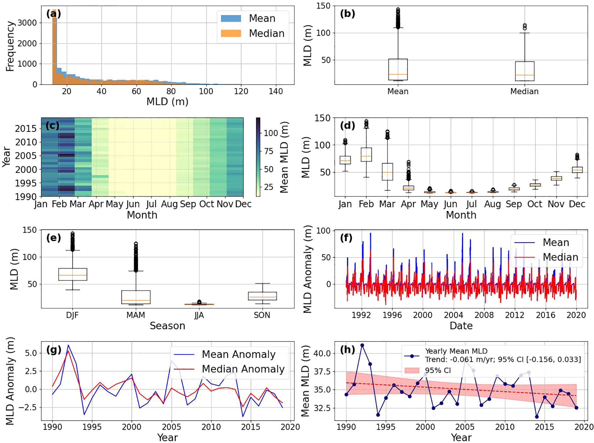 Overview of MLD variability from 1990 to 2019. For each day, MLD values from all model grid points are used to compute the spatial mean and median MLD, representing basin-wide conditions. (a, b) Distribution of daily MLD, showing histograms and boxplots for mean and median values. (c, d) Monthly statistics, including boxplots and a Hovmöller diagram, illustrating intra-annual variability. (e, f) Seasonal MLD distributions and anomalies relative to seasonal means. (g) Interannual variability of yearly MLD anomalies. (h) Yearly mean MLD with linear trend and 95% confidence interval; slope = –0.061 m/yr, 95% CI [–0.156, 0.033]. Seasonal abbreviations: DJF, December–February (winter); MAM, March–May (spring); JJA, June–August (summer); SON, September–November (autumn).