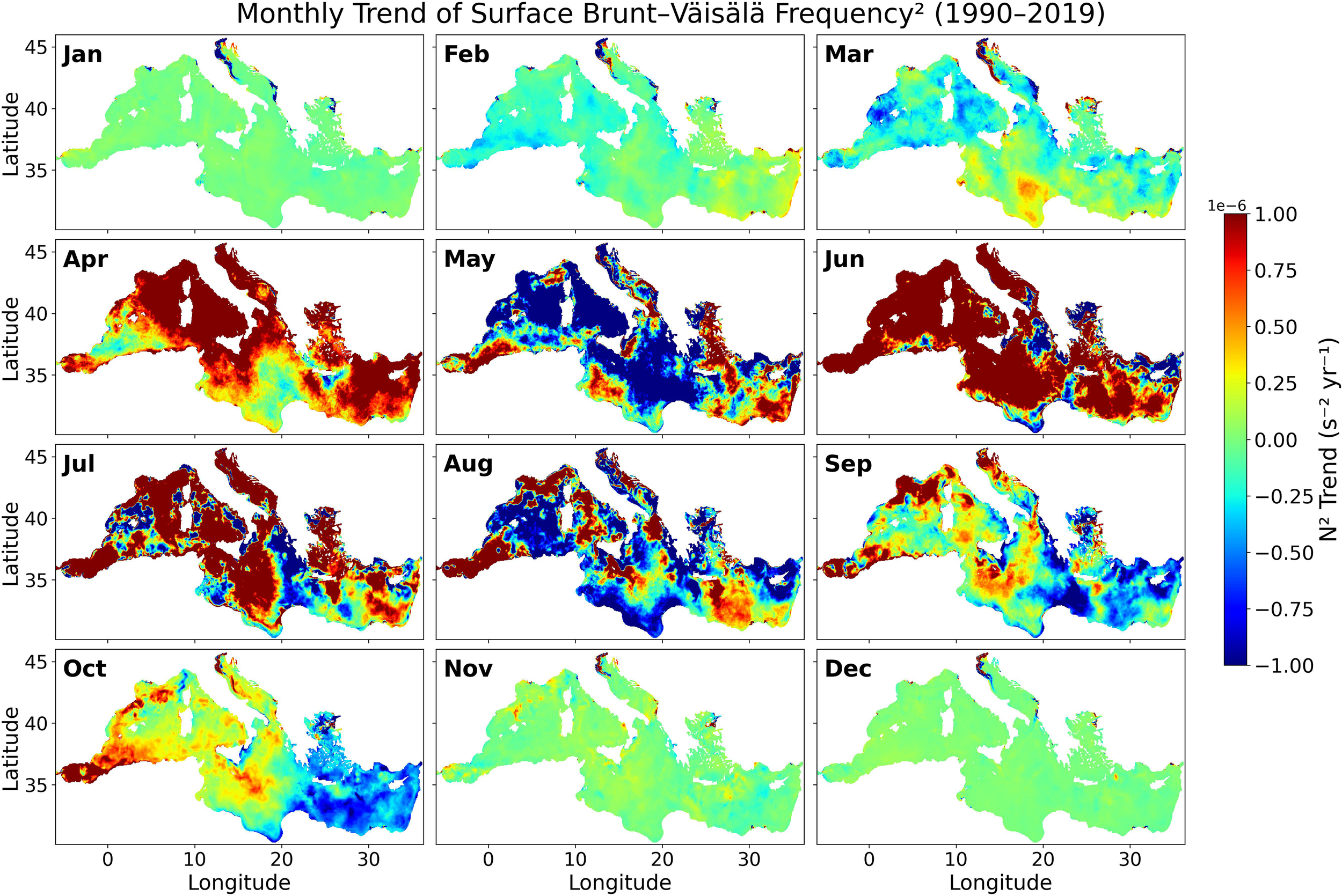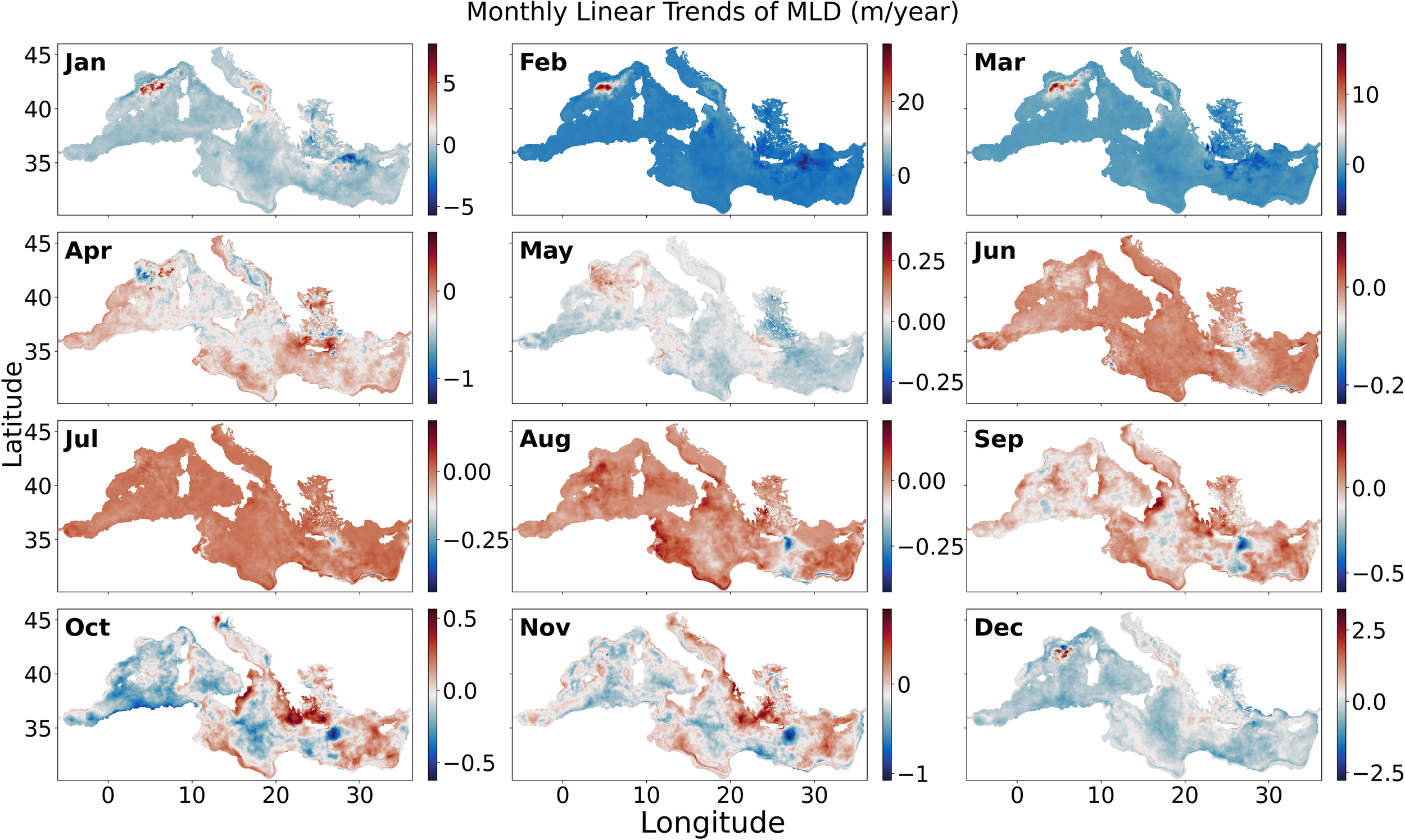 Monthly linear trends of mixed layer depth (MLD; m yr-1) over the Mediterranean Sea for the period 1990–2019. Each panel corresponds to a different month, showing the spatial distribution of the linear trend estimated at every grid point. Positive values indicate a deepening of the mixed layer, while negative values indicate a shoaling.