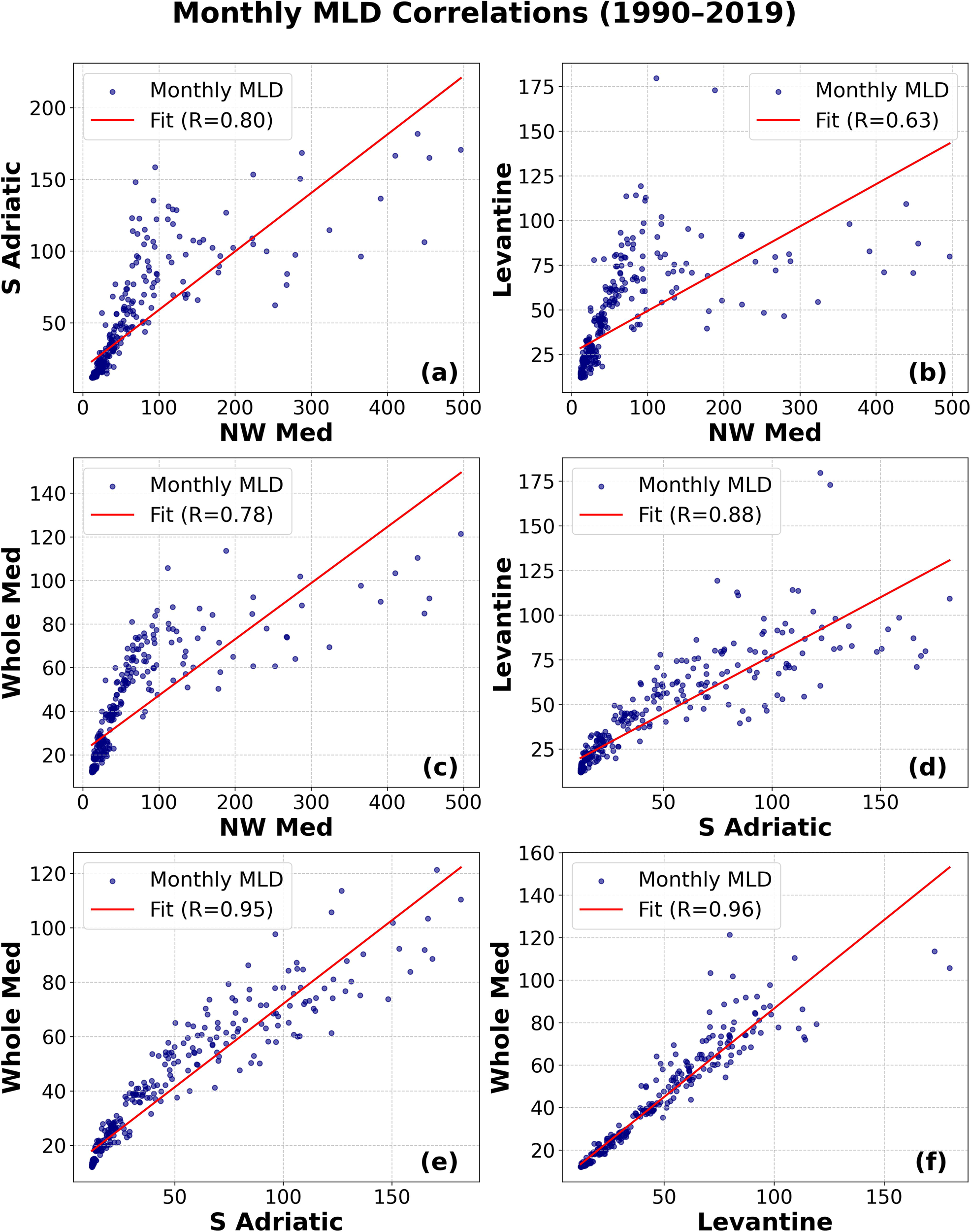 Monthly MLD correlations between Mediterranean sub-basins over the period 1990–2019. Each panel shows scatterplots of monthly mean MLDs for a pair of basins, with least-squares regression lines (red) and corresponding correlation coefficients (R).